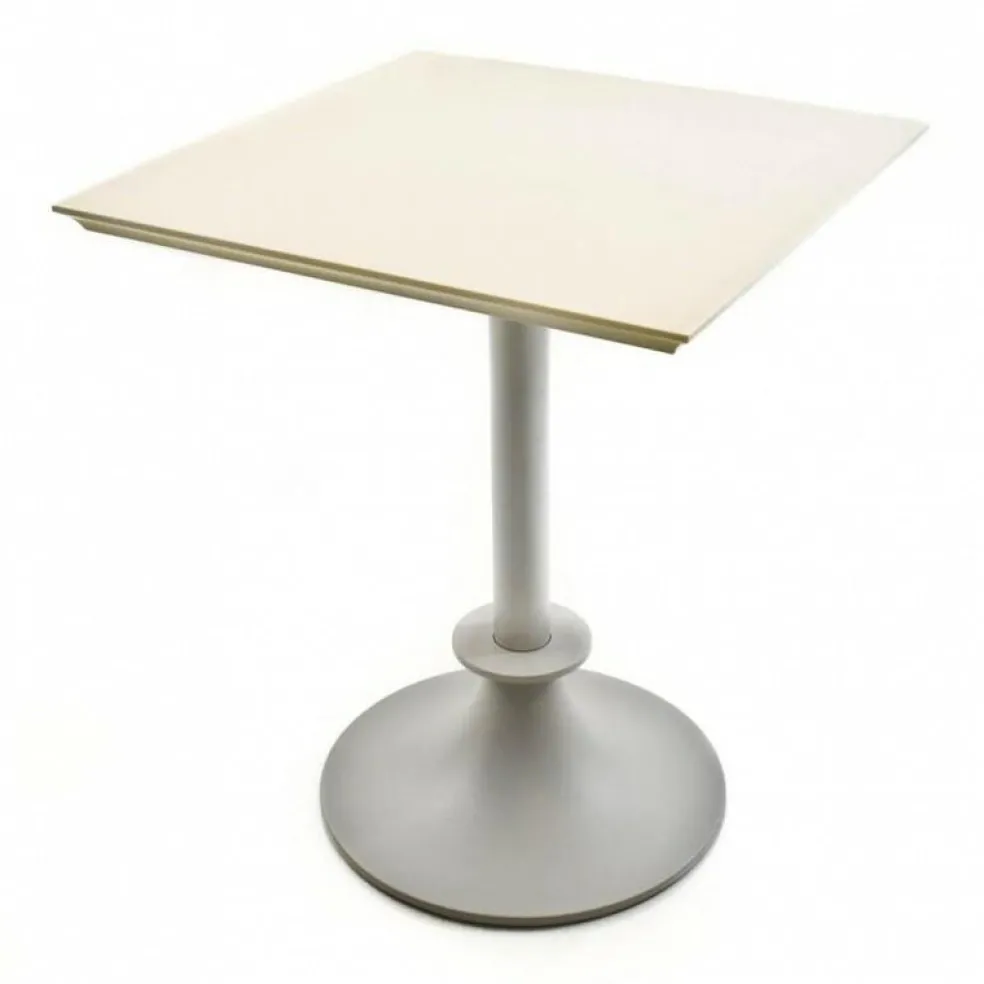 Die schmale, eckige Tischplatte aus hochwertigem SAN-Kunststoff bildet einen auffälligen Kontrast zu der voluminösen Rundsäule, die sie trägt. Gleichzeitig sind die Details dieses Designtisches von einer homogenen Formensprache geprägt. So springt die Kante in Form einer Hohlkehle zurück, was die schlanke Erscheinung der Tischplatte hervorhebt. In umgekehrter Weise läuft der Standfuß aus Aluminium unter einem abgesetzten Sockelring zu einer großzügigen Scheibe aus. Diese formalen Elemente sind von noblen Stilmöbeln bekannt. Der Materialmix zeichnet das Outdoormöbel durch eine langlebige Robustheit aus. Die Platte besticht zudem mit ihrer Witterungsbeständigkeit sowie einer hohen Resistenz gegen UV-Strahlung. So findet der Lord Yi Gartentisch nicht nur im Wintergarten, in einem Atrium oder auf der Terrasse Verwendung. Er kann auch mitten in der Wiese stehen: in einem Straßencafé, im Freiraum eines Hotels oder im Garten.