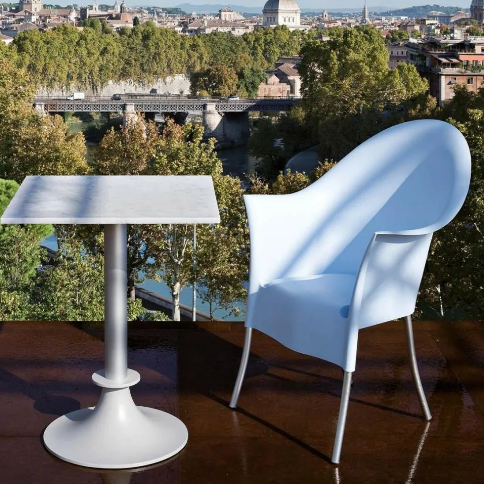 Der Lord Yi Gartentisch wurde von Philippe Starck für die Marke Driade entworfen. Er beeindruckt mit seinem extravaganten Fuß, der an eine Säule erinnert. Damit ist der Lord Yi Gartentisch eine noble Ergänzung zu den thronartigen Lord-Yi-Stühlen.