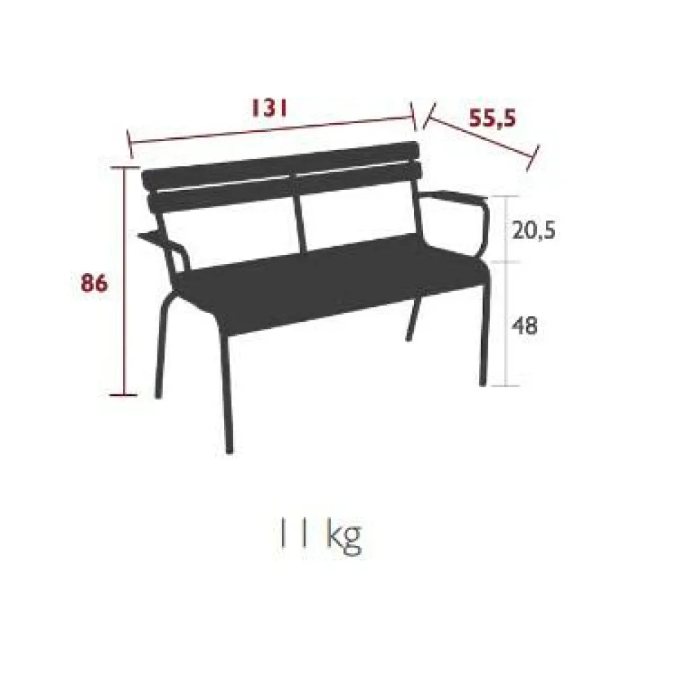 Mit einer Breite von 131cm bietet die Gartenbank Platz für zwei Personen. Sie ist 55,5cm tief, hat eine Sitzhöhe von 48cm und ist 86cm hoch. Ihre Armlehnen erreichen eine Höhe von 68,5cm. Die Luxembourg 2-Sitzer Gartenbank wiegt 11kg. Sie ist in vielen verschiedenen Farben erhältlich. Alternativ sind auch größere Bänke sowie Modelle ohne Arm- oder Rückenlehnen zu haben.