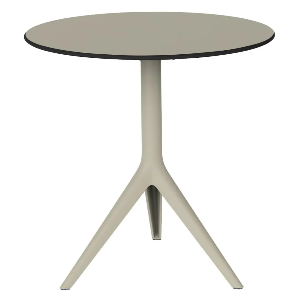 Der Mari-Sol Gartentisch Ø69cm besteht aus wetterfesten Materialien und kann daher auch bei schlechtem Wetter auf dem Balkon oder der Terrasse bleiben. Die Tischplatten werden aus hochwertigem HPL-Laminat hergestellt. In einem aufwendigen Verfahren werden durch Druck und Hitze mehrere Schichten miteinander verbunden. Somit entsteht eine robuste und pflegeleichte Oberfläche, die mit einem feuchten Tuch gereinigt werden kann. Kombiniert wird die runde Tischplatte mit einem dreibeinigen Standfuß, der in einer schlichten Stange endet. Dadurch überzeugt das Modell mit Beinfreiheit. Das Gestell ist aus Aluminium gefertigt, das mit einer Epoxidlackierung beschichtet wurde.