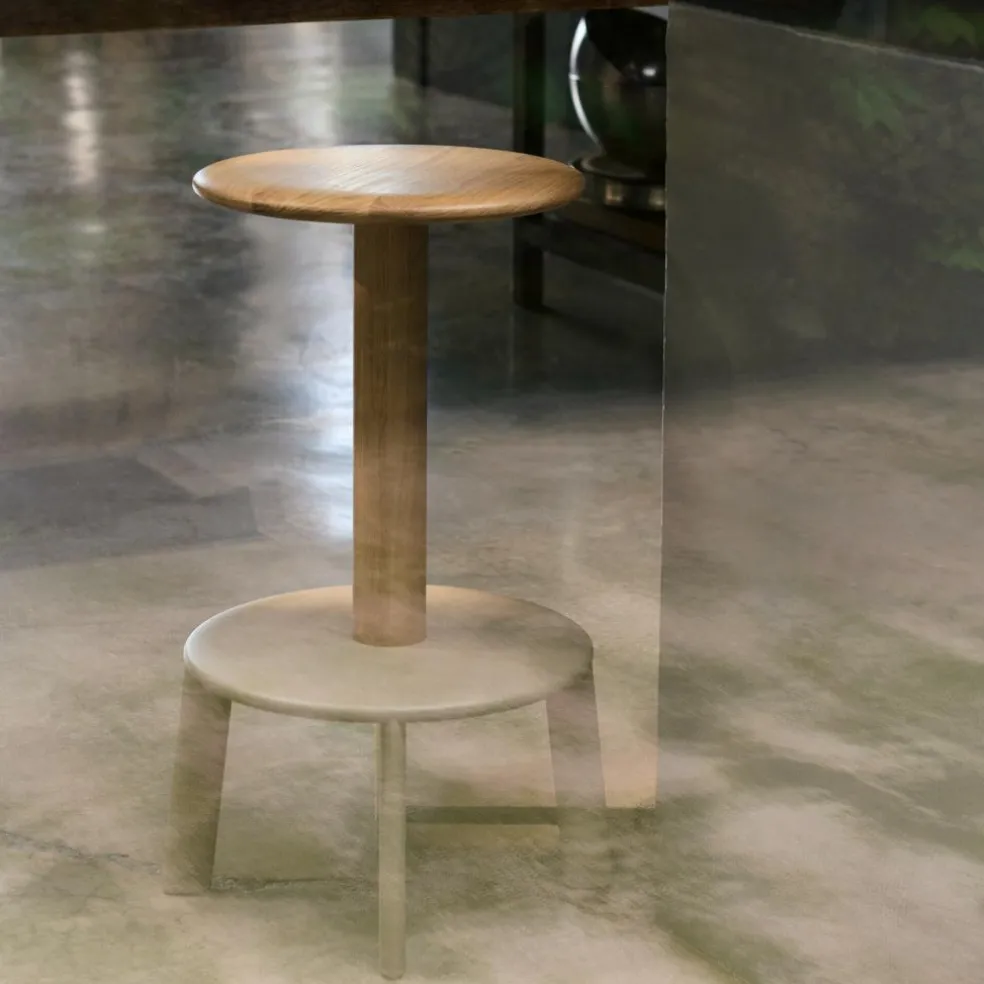 Eine namensgebend massive und durch ihre runden Formen gleichzeitig harmonische Designsprache zeichnet den Massif AV40 Barhocker aus. Ein mittiges Säulenbein trägt die kreisrunde Sitzfläche. Die runde Form findet sich als umlaufende Fußstütze wieder. Diese dient gleichzeitig als Basis für die vier leicht ausgestellten und abgerundeten Beine. Die Sitzfläche und das Säulenbein sind aus massivem Eichenholz aus FSC®®-zertifizierter Herstellung gearbeitet und mit einem schadstoffreduzierten Lack auf Wasserbasis beschichtet. Als Besonderheit ist die Sitzfläche drehbar und mit einem Schwenkmechanismus aus lasergeschnittenem Edelstahl und Nylon mit dem Säulenbein verbunden. Die Basis und die Beine sind aus pulverbeschichtetem Stahl gefertigt. Kunststoffgleiter unter den Füßen schützen den Boden.