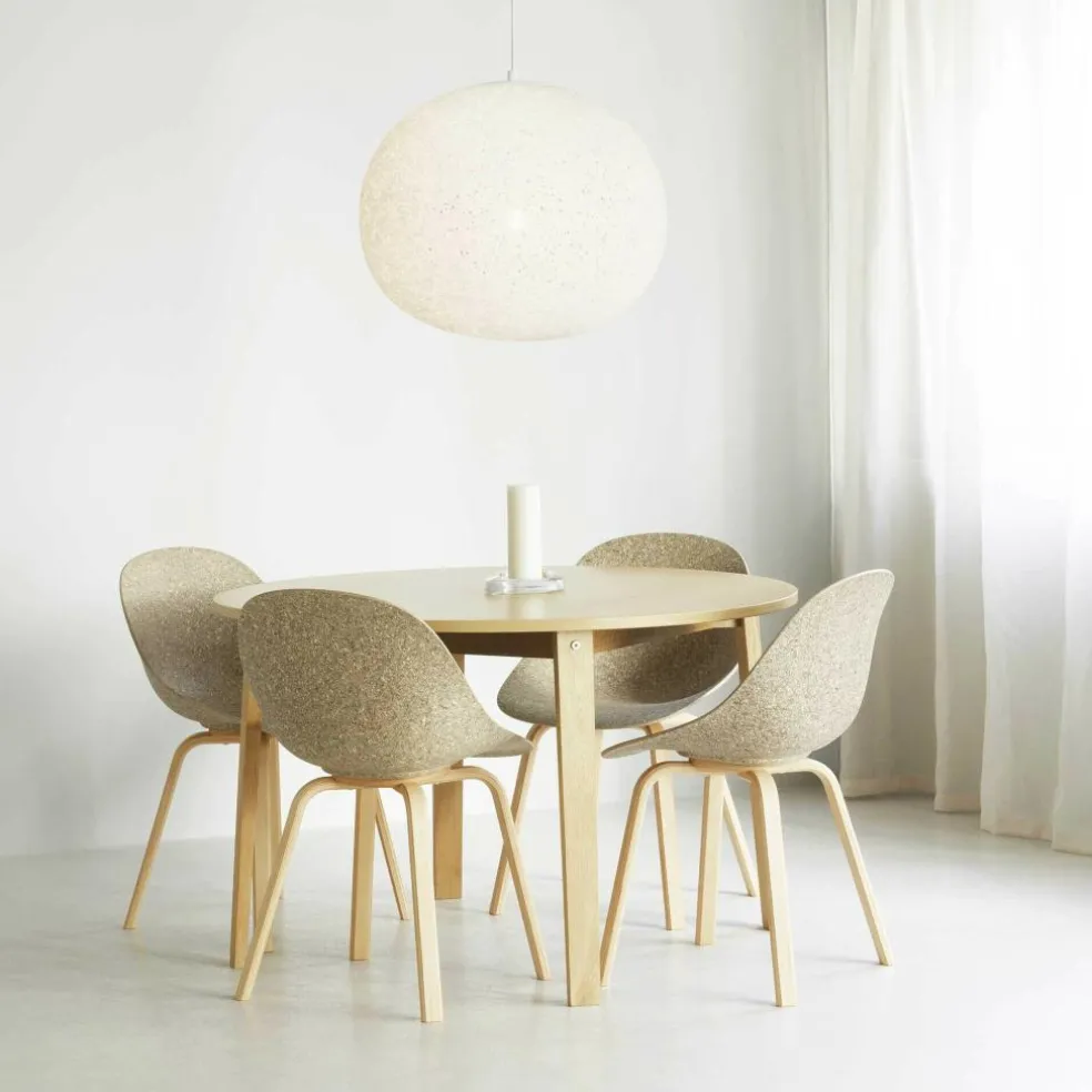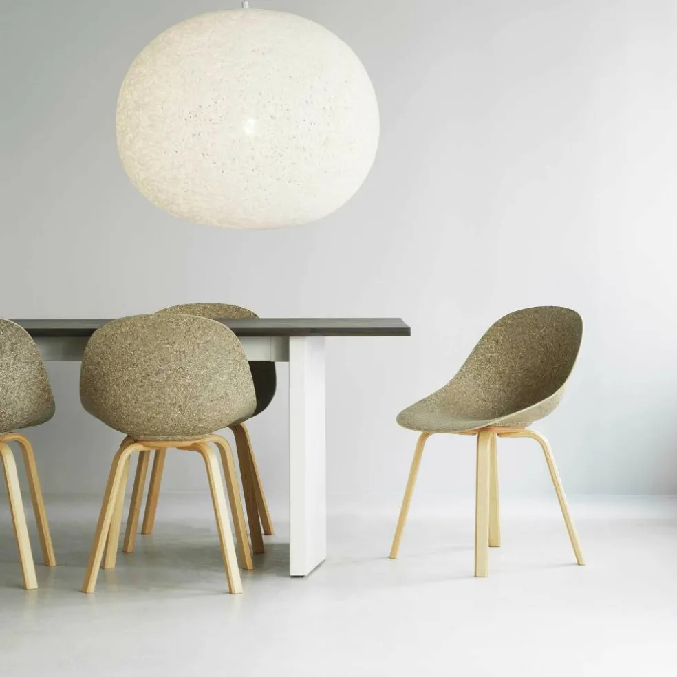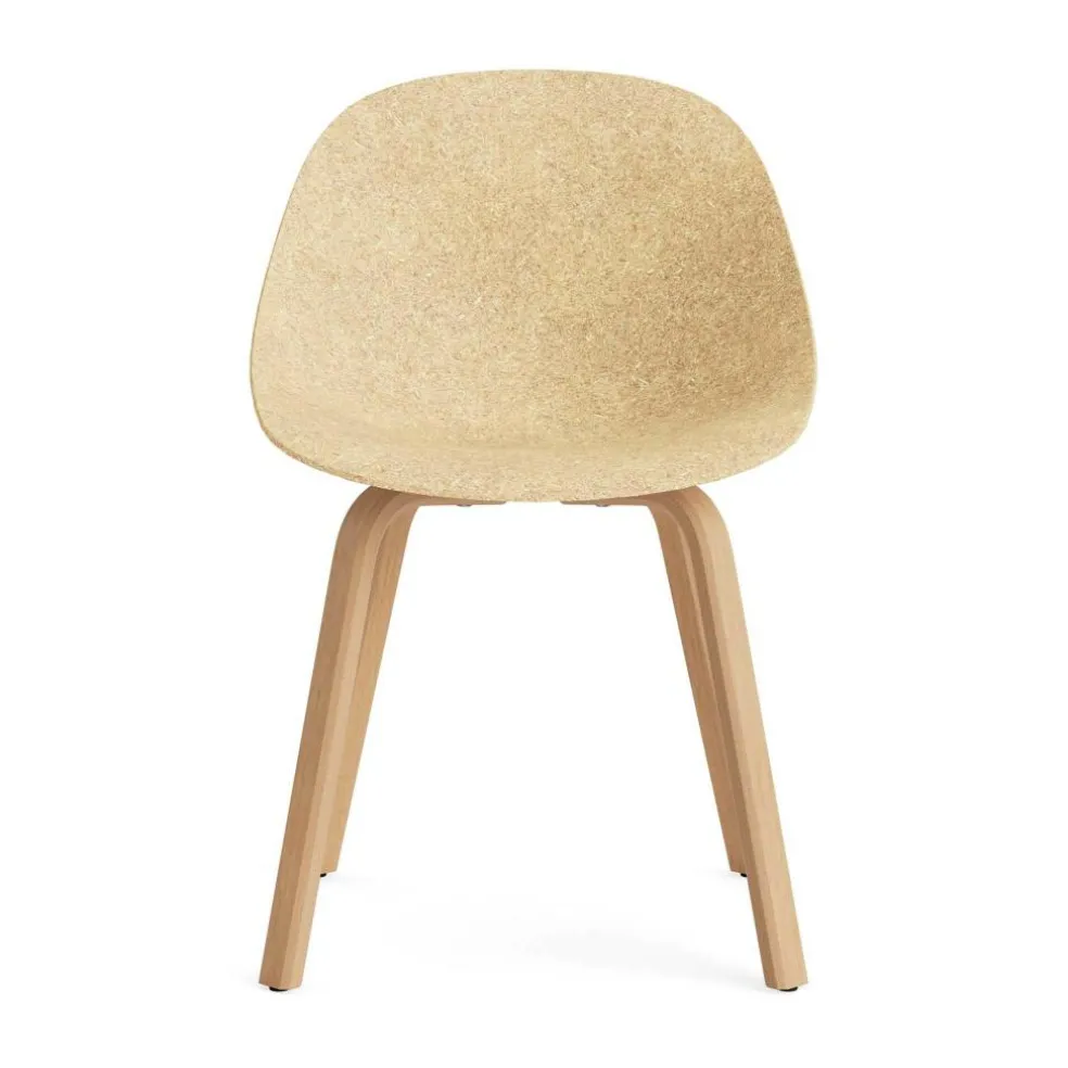 Der Mat Stuhl ist ein zirkulär gedachter Design-Stuhl, der neue Ansätze einer nachhaltigen und ressourcenschonenden Fertigung verkörpert. Jahrelange Forschungsarbeit ging der Mat Kollektion voraus, deren Name sich von dem englischen Wort Materials ableitet. Denn die genutzten Materialien sind die Essenz und das Alleinstellungsmerkmal der verantwortungsbewussten Serie. Die Schale des Mat Stuhl ist je nach Auswahl nur aus Hanffasern – 75 % Hanffasern und 25 % speziell entwickeltes, recycelbares Bico-Bindemittel – oder aus einer Mischung aus Hanffasern und Seegras beziehungsweise Seetang – 69 % Hanffasern, 6 % Seegras / Algen und 25 % Bico-Bindemittel. Alle Materialien sind in hohem Maße erneuerbar und langlebig. Sie belasten die Umwelt möglichst wenig und deutlich geringer als es in der Industrie-Norm üblich ist. Das Gestell des Mat Stuhl wird aus FSC®-zertifiziertem Buchensperrholz und Buchensperrholz aus anderen kontrollierten Quellen gefertigt. Der schöne, nachhaltige Mat Stuhl könnte nach einem langen Leben als hochwertiger Esstischstuhl an den Hersteller Normann Copenhagen zurückgegeben, komplett demontiert und recycelt werden. Der komfortable Stuhl mit den ausladenden Beinen und der runden Sitzschale ist 51,5 cm breit und 53 cm. Seine Höhe liegt bei 79 cm, während die Sitzhöhe 45 cm ist. Er wiegt 4,5 kg.
