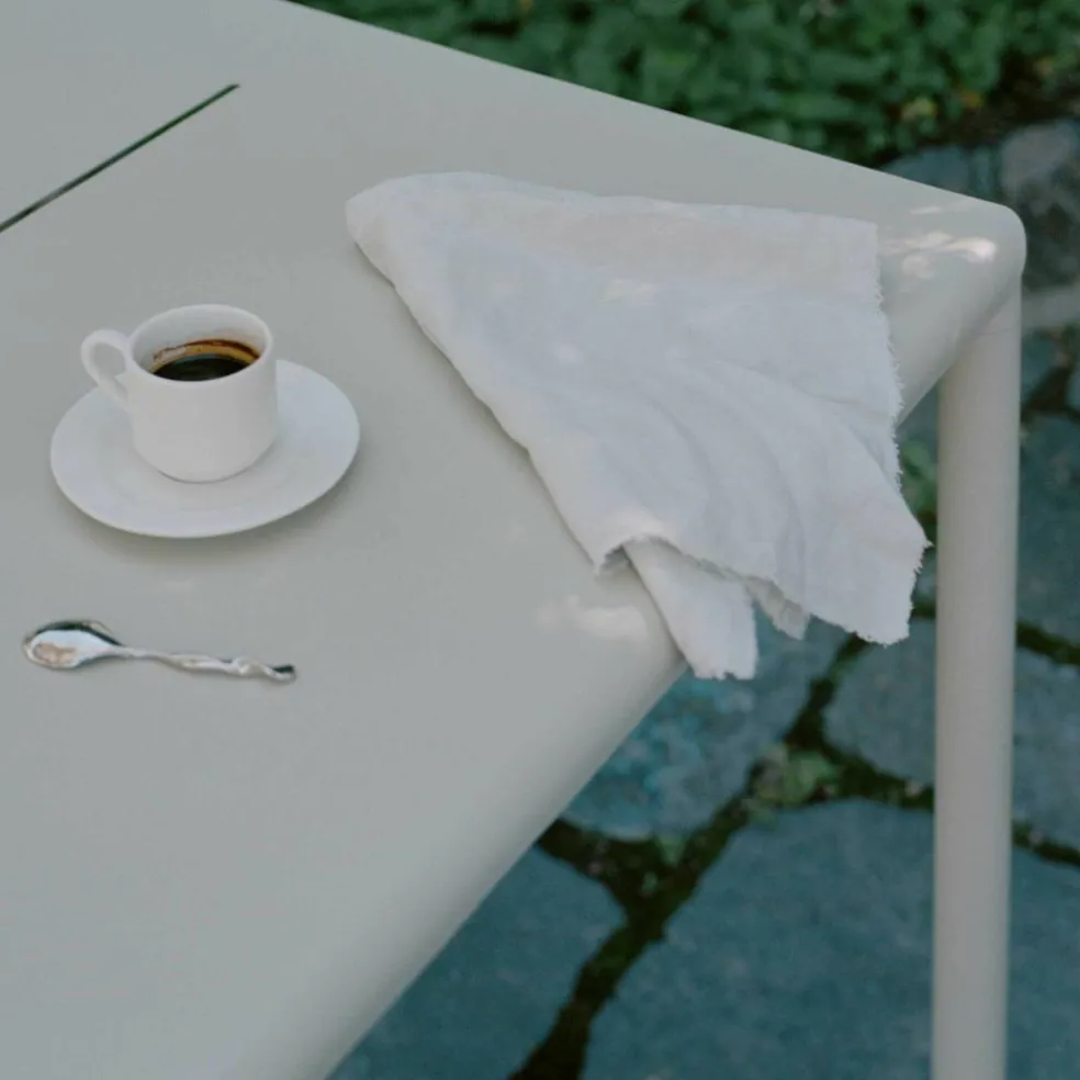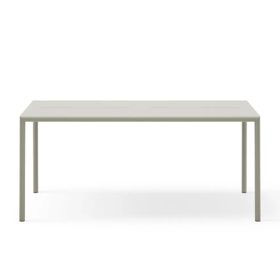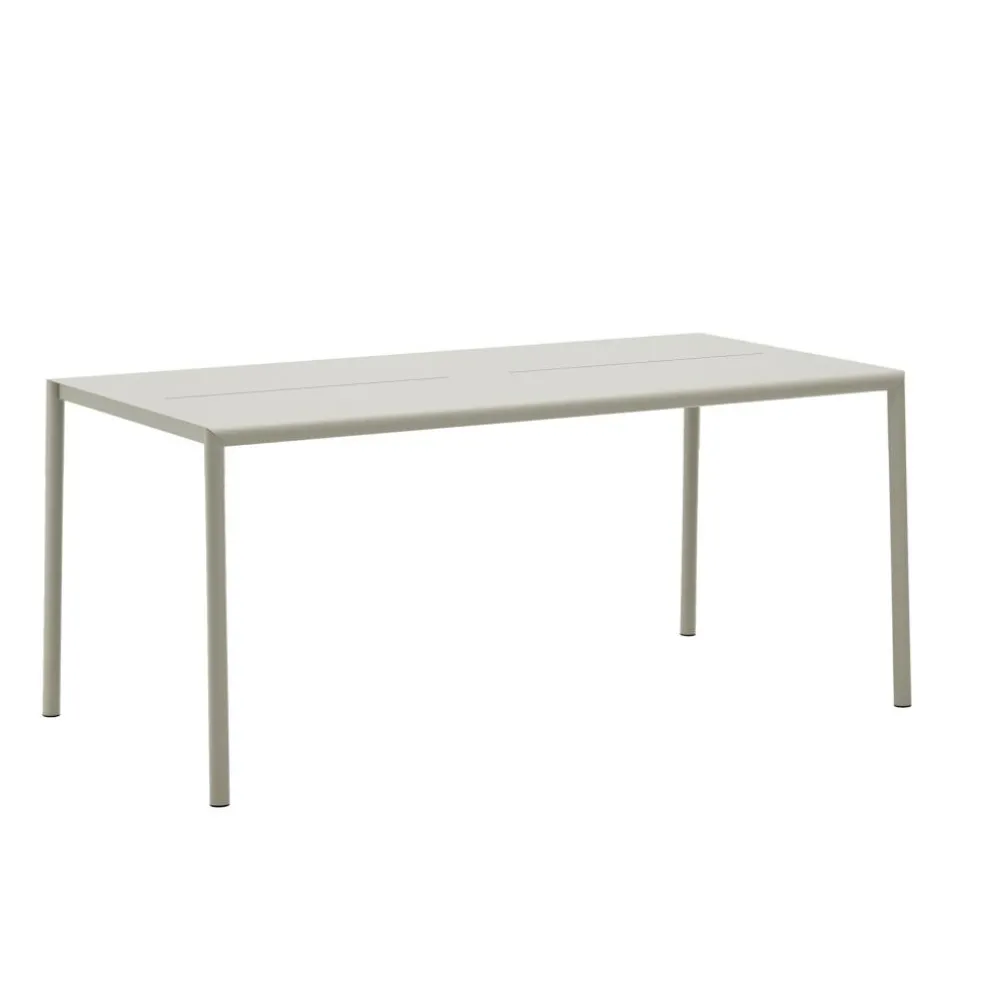 Eine bewusst sehr schlichte Formgebung zeichnet den May Gartentisch 170x85cm aus. Er besteht für die wetterfeste und strapazierfähige Nutzung im Außenbereich aus Stahl mit pulverbeschichteter Oberfläche. Seine Tischplatte aus Stahlblech mit schmaler Kante ist ebenso filigran gearbeitet wie die vier Beine in schlanker Säulenform mit bodenschützenden Kappen. Eine funktionale Besonderheit sind die beiden schmalen, in der Länge verlaufenden Aussparungen auf der Tischplatte, dank denen Regenwasser schnell abtropfen kann.