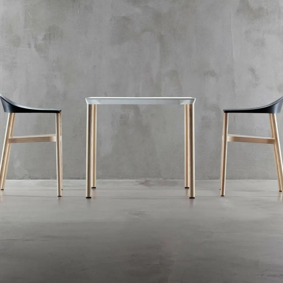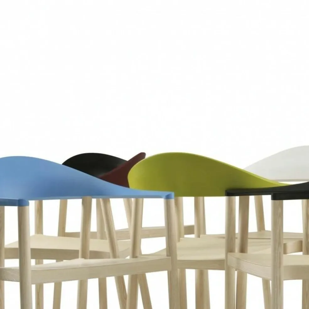 Der Myto Stuhl besitzt einen Charakter, der durch den Kunststoffaufsatz definiert wird, der einerseits für die Stabilität der Konstruktion sorgt und darüber hinaus dem Stuhl Komfort sowie Farbigkeit verleiht.