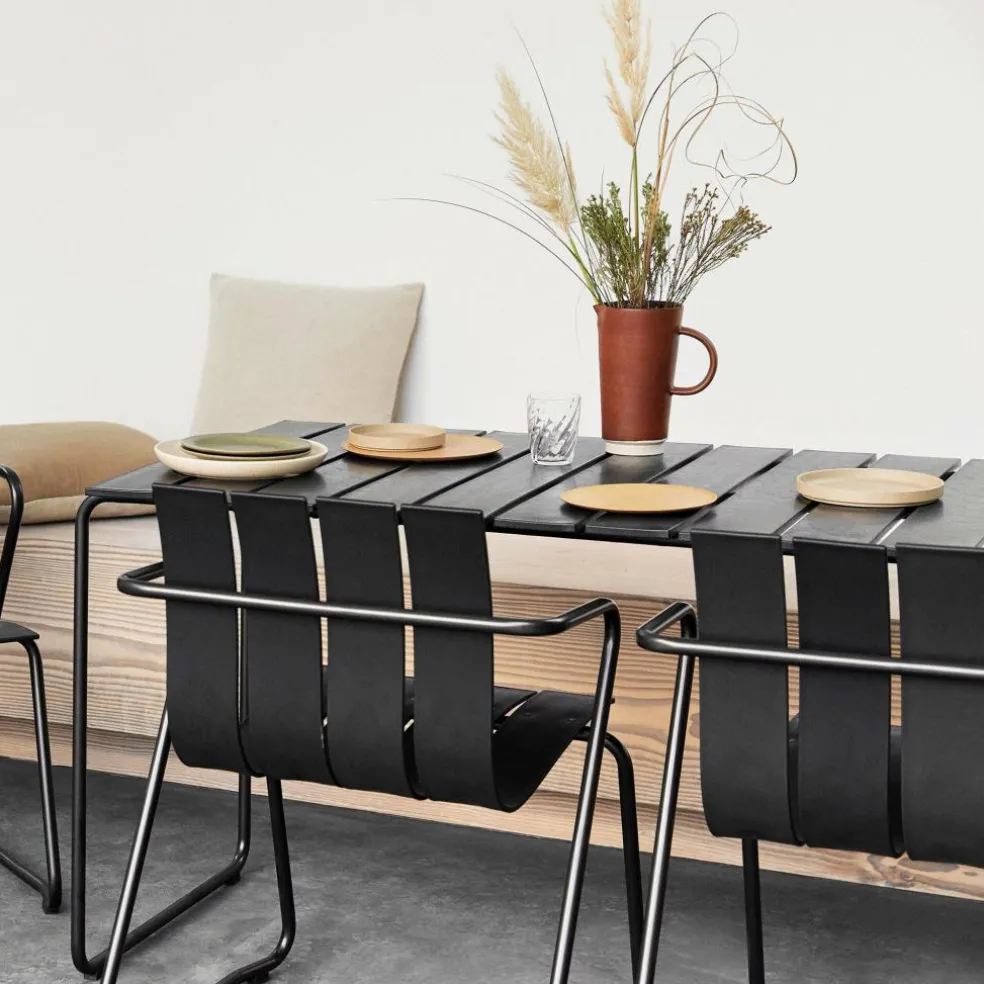 Die moderne Auflage des Ocean Esstisch 140x70cm setzt sich zur Gänze aus recycelten Materialien zusammen, die dem Meer entnommen wurden. Die einzelnen Lamellen, die auf ein filigranes Stahlgestell gespannt sind, bestehen aus Fischernetzen und Kunststoffabfällen. Diese bereits verwendeten Materialien stammen vom dänischen Unternehmen Plastix, das sich als weltweit einziger Kämpfer für die Produktion von sogenanntem Green Plastic erweist, das aus Abfallprodukten hochwertige Kunststoffe herstellt.