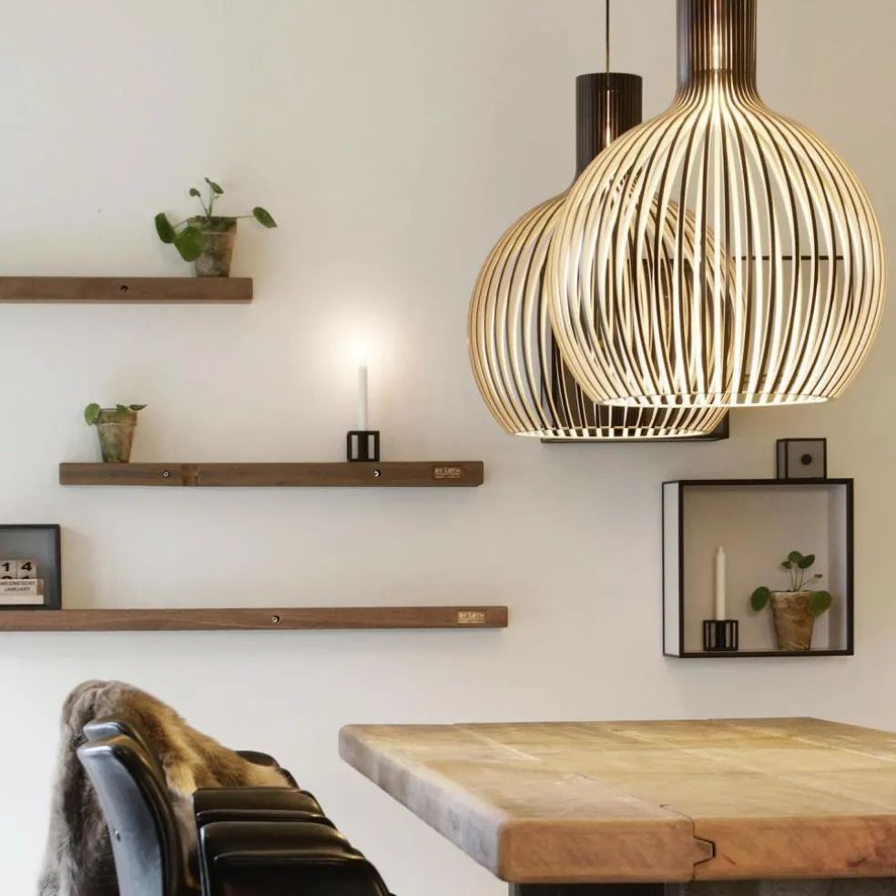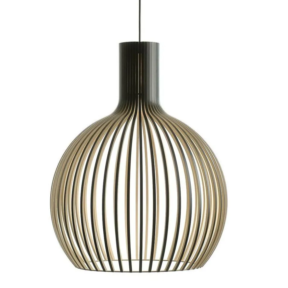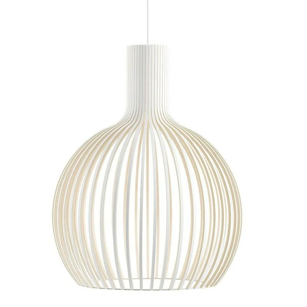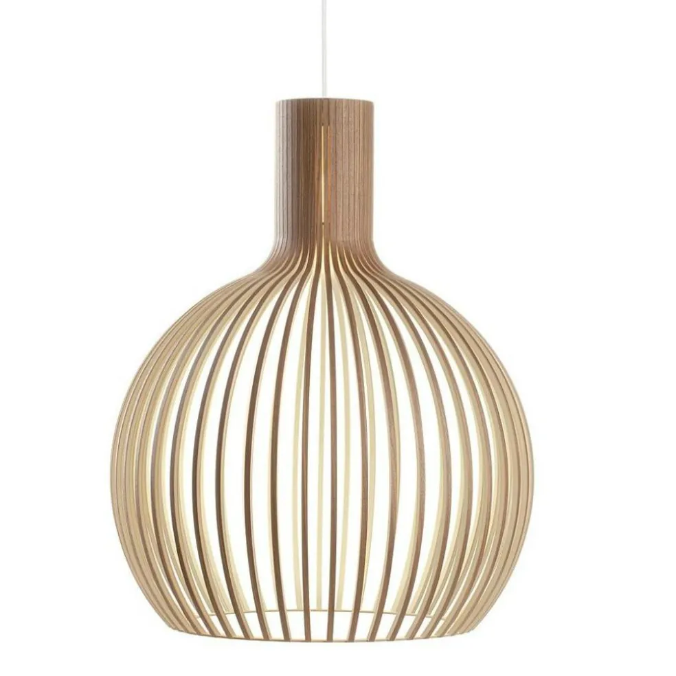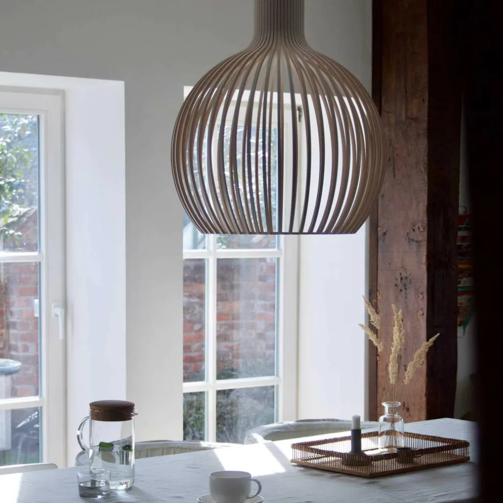 Der Lampenschirm besteht aus unbehandelten, finnischen Birkenholzleisten und wurde von Hand gefertigt. Eine Konstruktion aus Flugzeugsperrholz schafft eine Verbindung zwischen den einzelnen Leisten. Das Leuchtmittel der Lampe ist im Hals des Schirms versteckt. So verbreitet das warme Licht der Octo 4240 Pendelleuchte eine wohlige Atmosphäre.