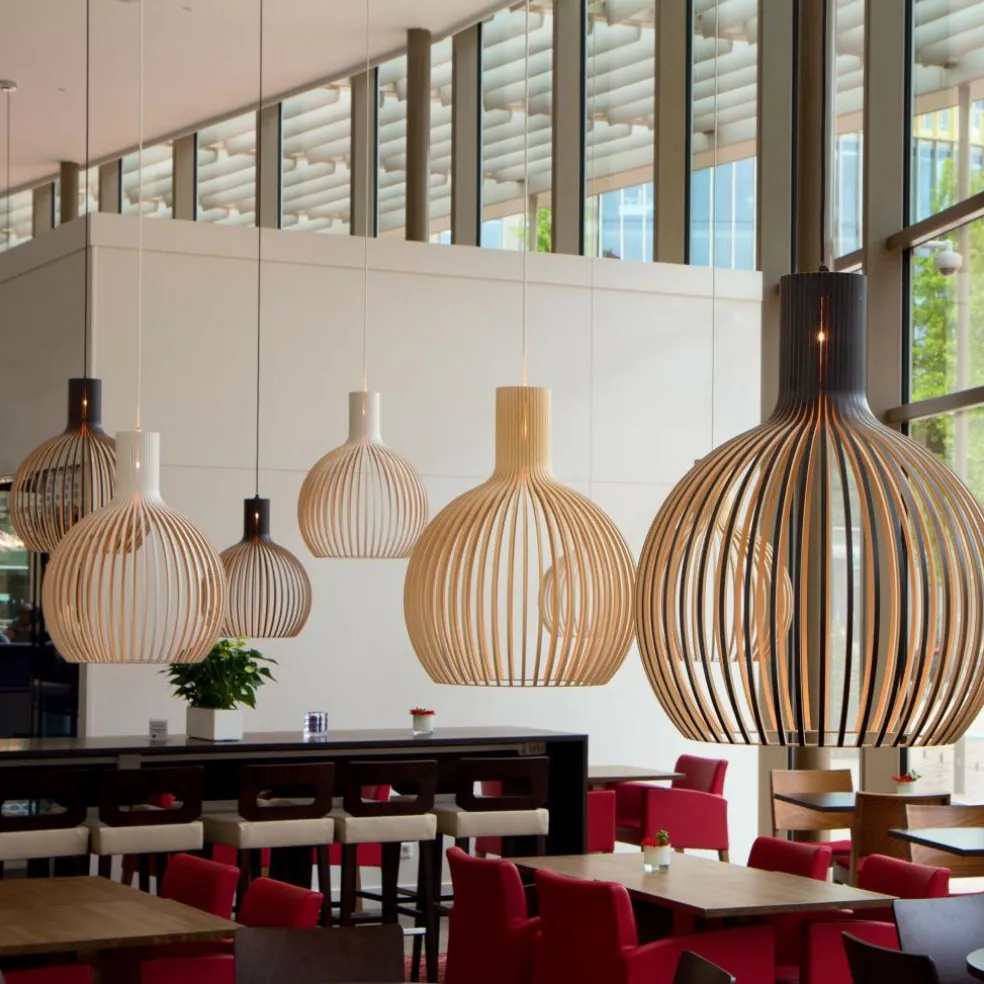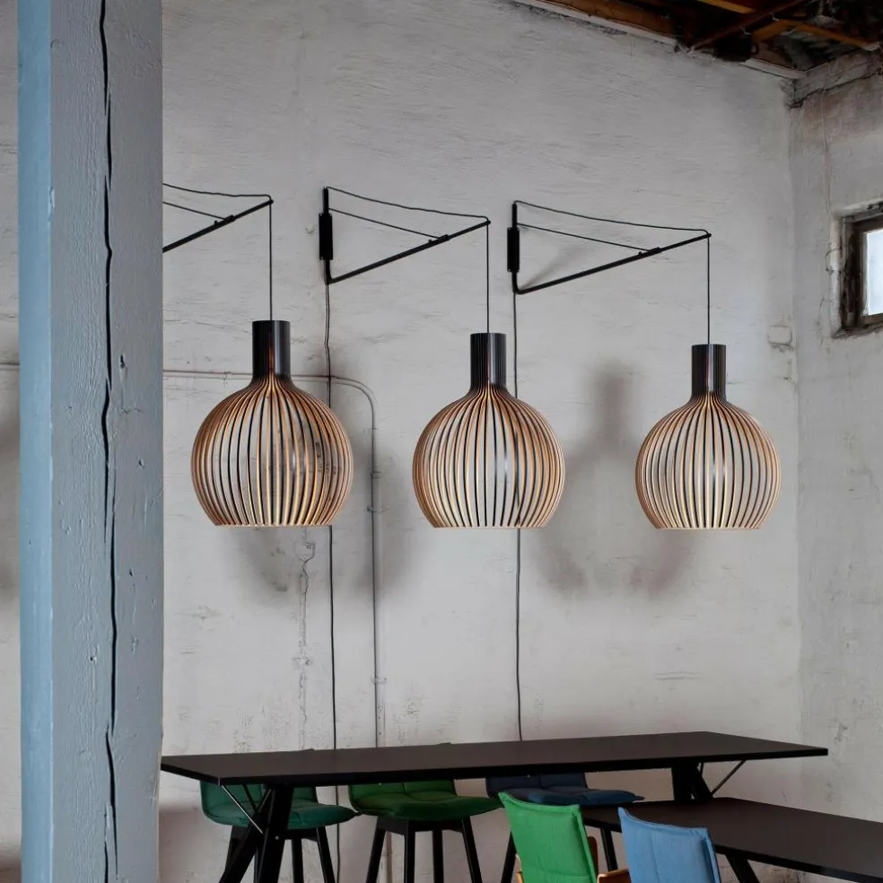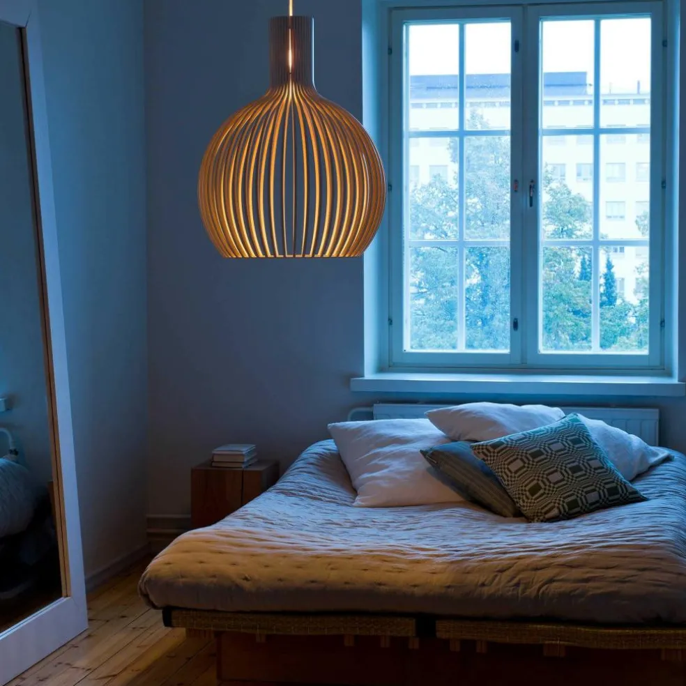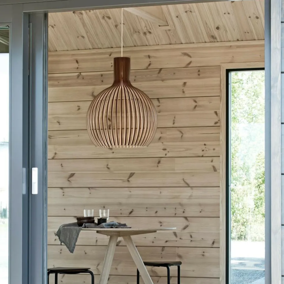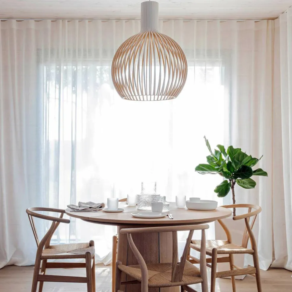 Der Lampenschirm besteht aus unbehandelten, finnischen Birkenholzleisten und wurde von Hand gefertigt. Eine Konstruktion aus Flugzeugsperrholz schafft eine Verbindung zwischen den einzelnen Leisten. Das Leuchtmittel der Lampe ist im Hals des Schirms versteckt. So verbreitet das warme Licht der Octo 4240 Pendelleuchte eine wohlige Atmosphäre.