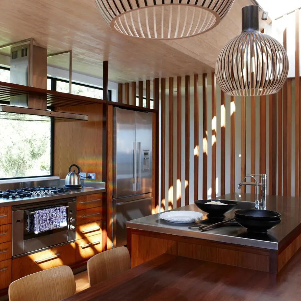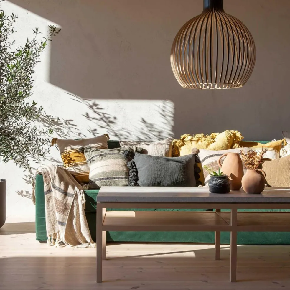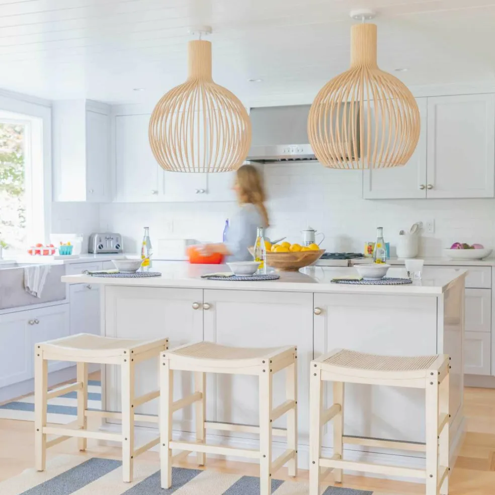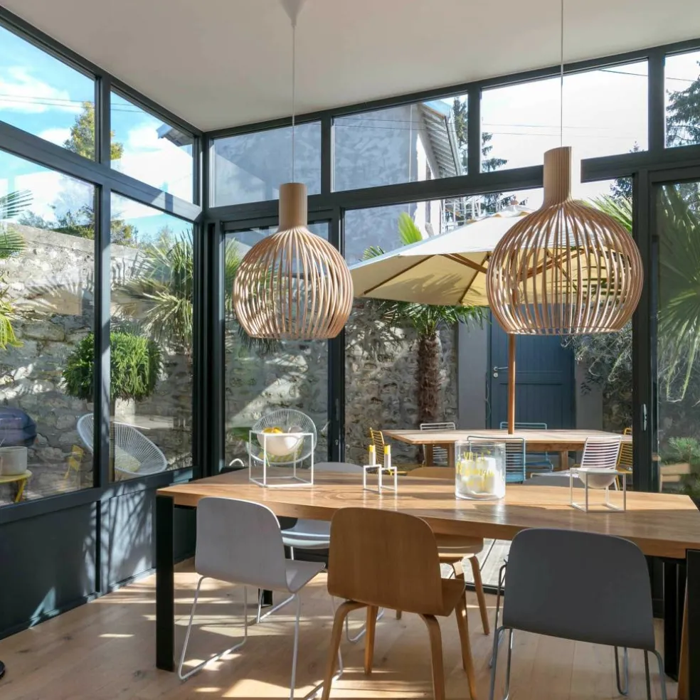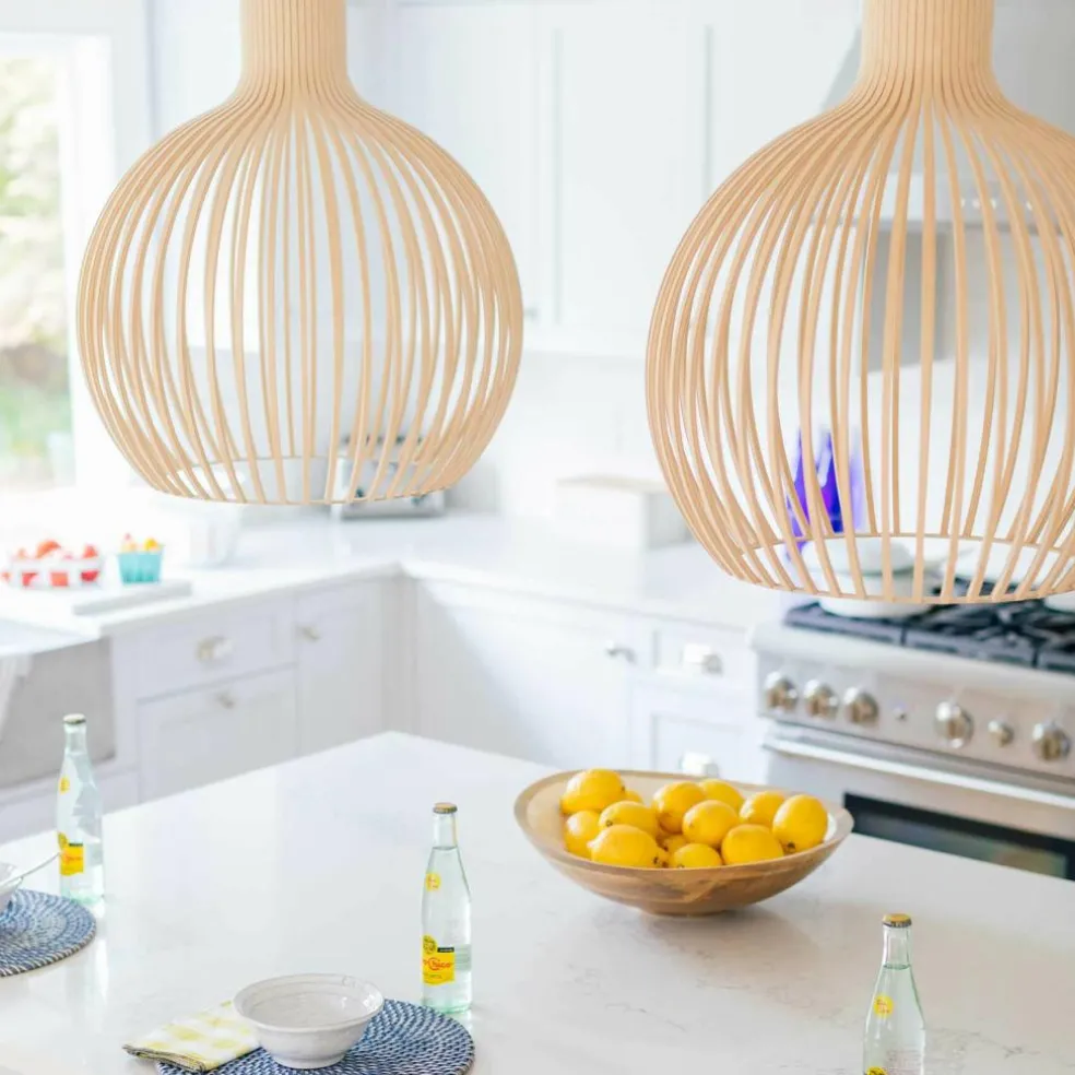 Der Lampenschirm besteht aus unbehandelten, finnischen Birkenholzleisten und wurde von Hand gefertigt. Eine Konstruktion aus Flugzeugsperrholz schafft eine Verbindung zwischen den einzelnen Leisten. Das Leuchtmittel der Lampe ist im Hals des Schirms versteckt. So verbreitet das warme Licht der Octo 4240 Pendelleuchte eine wohlige Atmosphäre.
