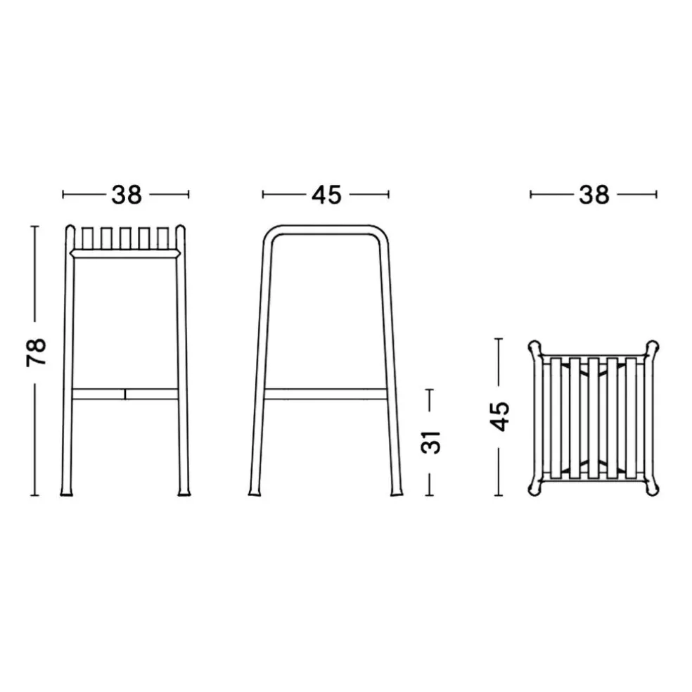 Mit seiner markanten Fläche, die sich aus flachen, locker nebeneinanderliegenden Metallbändern zusammensetzt und großzügig über die vordere und hintere Sitzkante wirft, reiht sich der Palissade Barhocker 78cm in eine variantenreiche Outdoorserie ein, die dank ihrer streifenartig angeordneten Elemente viel Hintergrund durchblitzen lässt. Damit macht sich das Sitzmöbel in jedem Ambiente gut: Es passt an den Tresen eines Straßencafés, auf eine Barterrasse oder ins Atrium eines Designhotels sowie bei einer Gartenparty mitten ins Grün. Ein formschön gebogenes und robustes Gestell aus Rundstahl verleiht dem Palissade Barhocker 78cm eine belastbare Stabilität. Seine Oberfläche, die je nach gewählter Ausführung feuerverzinkt oder pulverbeschichtet ist, macht das moderne Barmöbel witterungsbeständig und strapazierfähig. Es ist empfohlen, den Barhocker nach einem Regenschauer trocken zu wischen.