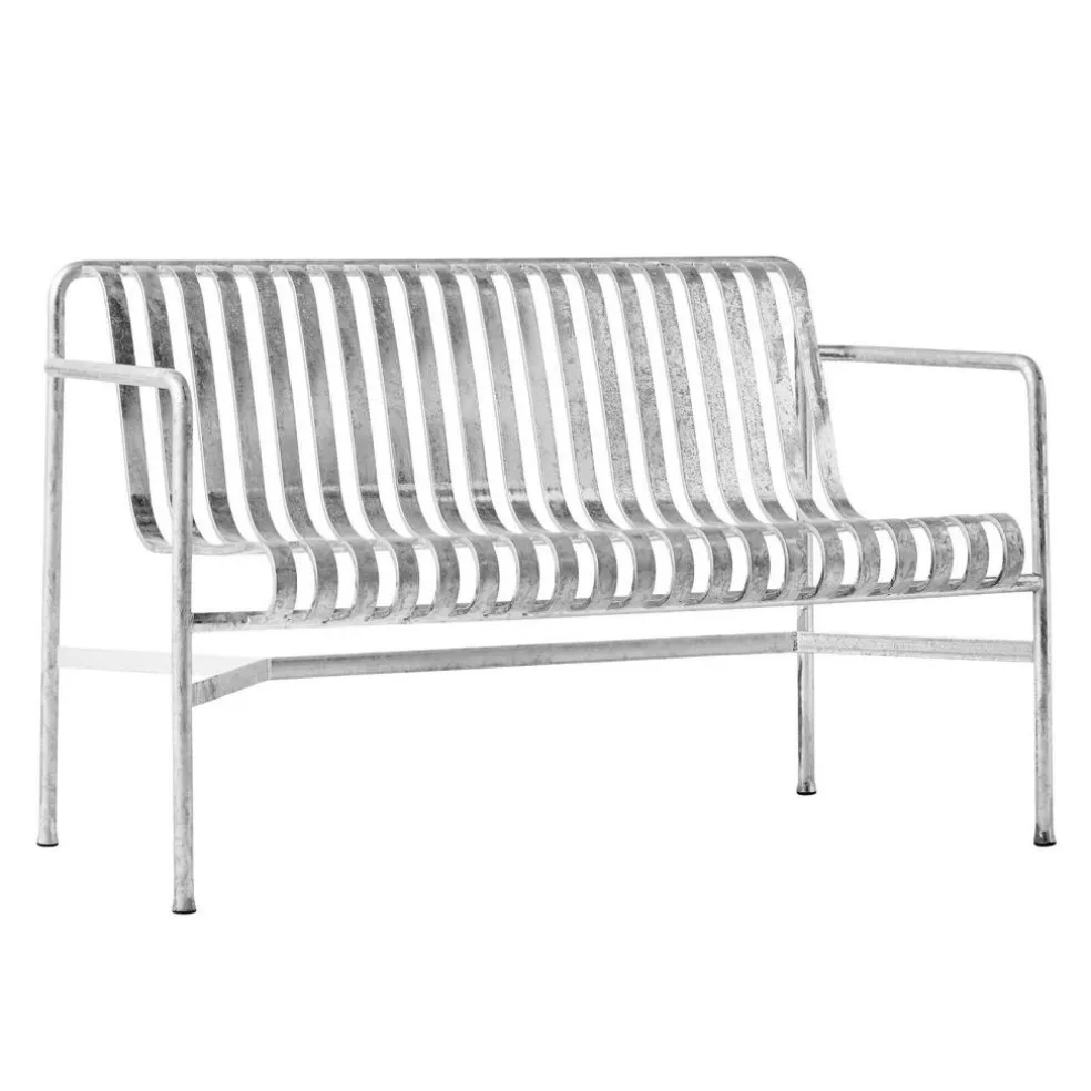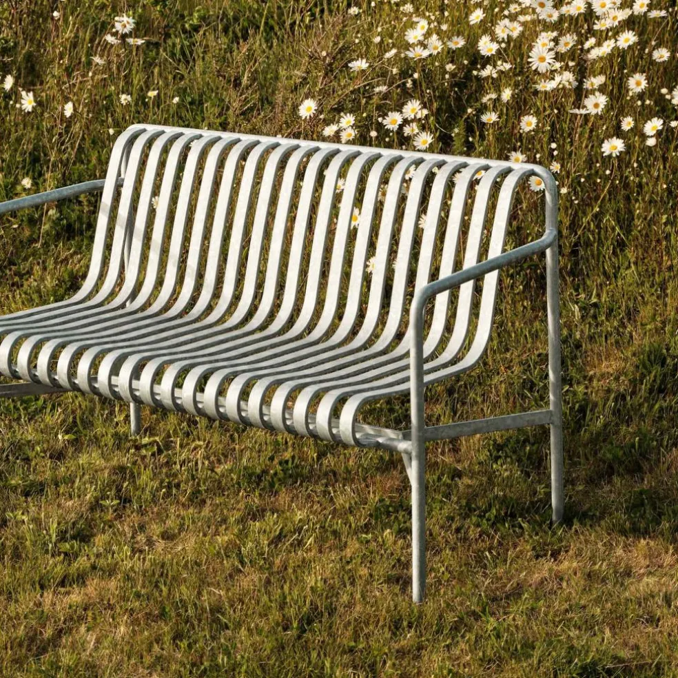 Die Palissade Dining Gartenbank Feuerverzinkt wurde von Erwan Bouroullec und Ronan Bouroullec für die Marke HAY entworfen. Sie ist ein Teil der Palissade-Kollektion, die sich aus stilvollen Gartenmöbeln in einem streng geometrischen Muster zusammensetzt.