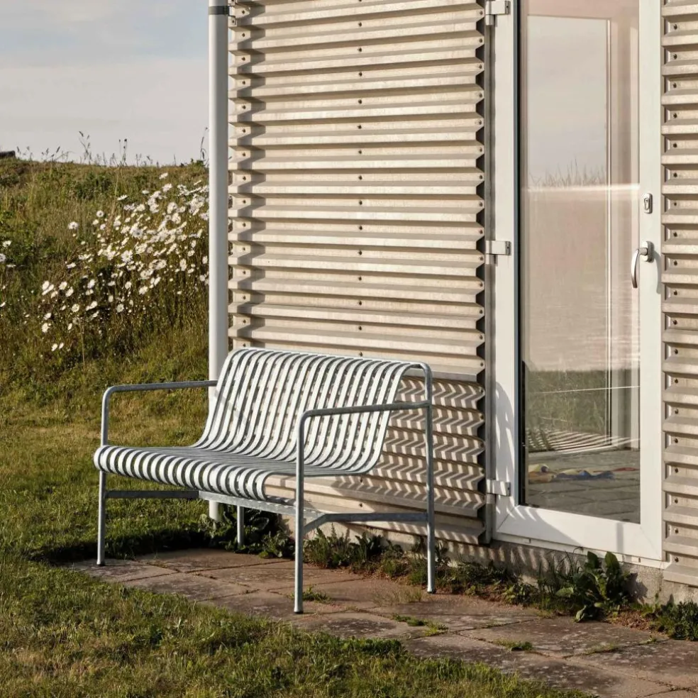 Fallen Sonnenstrahlen auf die Palissade Dining Gartenbank Feuerverzinkt, entsteht am Boden und an umliegenden Wänden ein interessantes Muster. Möglich gemacht werden die Schattenstreifen durch die Spalten der rechteckig geformten Lamellen. Sie bilden die Rückenlehne und die Sitzfläche der bequemen Bank. Wer auf der Palissade Dining Gartenbank Feuerverzinkt Platz nimmt, möchte am liebsten gar nicht mehr aufstehen. So komfortabel ist nämlich die ergonomisch geformte Sitzfläche. Eigentlich war die feuerverzinkte Variante der Palissade-Gartenmöbel als Sonderedition für einen Spezialauftrag gedacht, wegen des großen Erfolgs produziert die Marke HAY die Bank aber in Serie.