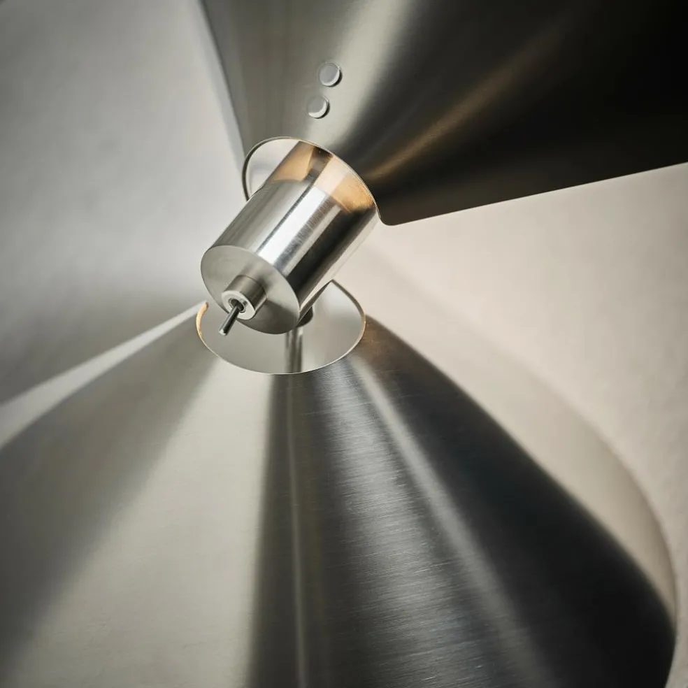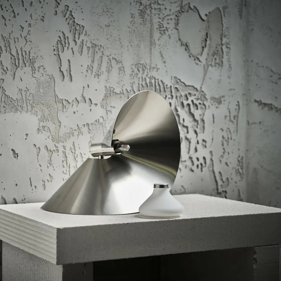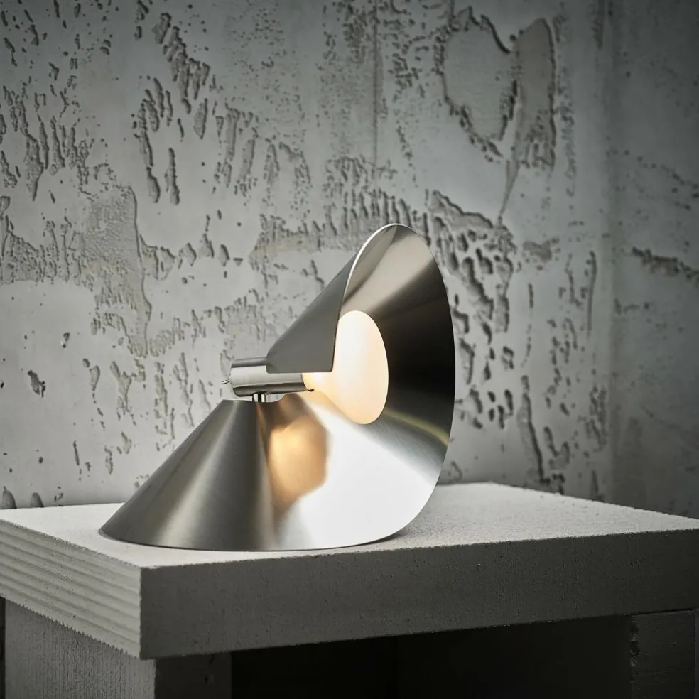 Spannend ist die Gestaltung der Tischleuchte aus einem einzigen Stück gebürstetem Edelstahlblech. Das Material ist schleifenförmig zu zwei identischen offenen Kegeln gebogen. Es vermittelt namensgebend den Eindruck eines sich schälenden Materials, das zur einen Seite die Leuchtenfassung als Diffusor umrahmt und zur anderen Seite in Form eines stehenden Kegels als Standfuß fungiert. Das Licht strahlt frontal in einem breiten Lichtkegel ab und eignet sich dank des blendfreien Diffusors gut als dezentes Stimmungslicht.