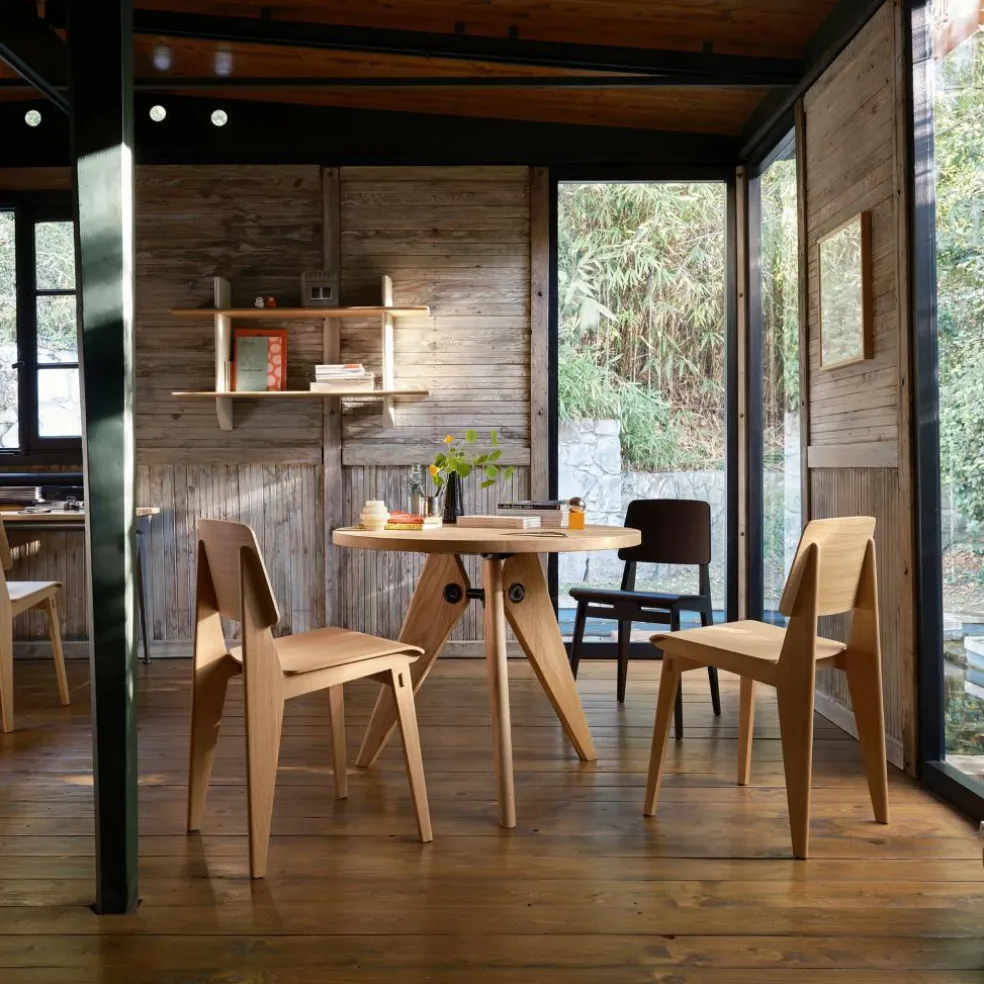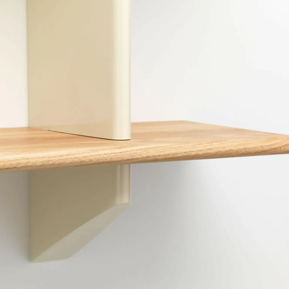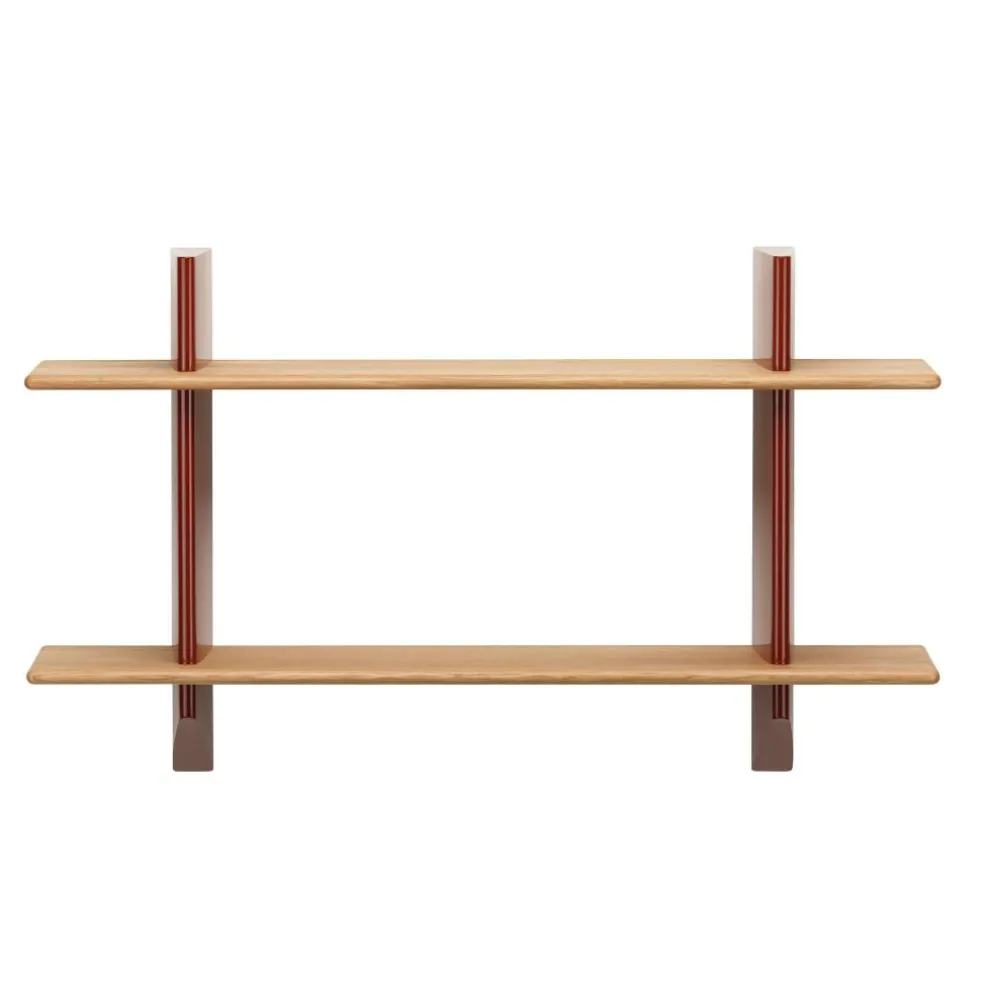 Zwei horizontale Platten als Regalböden, zwei vertikale Elemente als Wandhalterung: Damit ist das Rayonnage Wandregal platzsparend, praktisch und schafft darüber hinaus eine dekorative Gliederung der Wand. Dabei besticht das Wandregal nicht nur mit seiner einfachen Konstruktion. Die Wandelemente sind aus gebogenem Stahlblech gefertigt, das dank seiner abgerundeten Vorderseite und der schrägen Unterkante an einen Flugzeugflügel oder ein Schiffsruder erinnert – eine typische Form in Prouvés Entwürfen. Präzise gearbeitete Einschübe für die Regalböden versprechen eine hohe Stabilität. Je nach gewählter Ausführung schaffen die lackierten Elemente einen knalligen Farbtupfer an der Wand oder treten dezent in den Hintergrund. Die gebeizten und geölten Holzböden aus massiver Eiche erzeugen mit ihrer zarten Maserung eine natürliche Wirkung. So ist das Rayonnage Wandregal in jedem Wohnraum einsetzbar und passt ebenso gut ins Büro, in einen Laden oder in ein Lokal.
