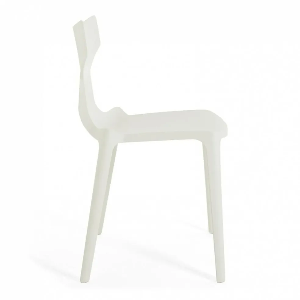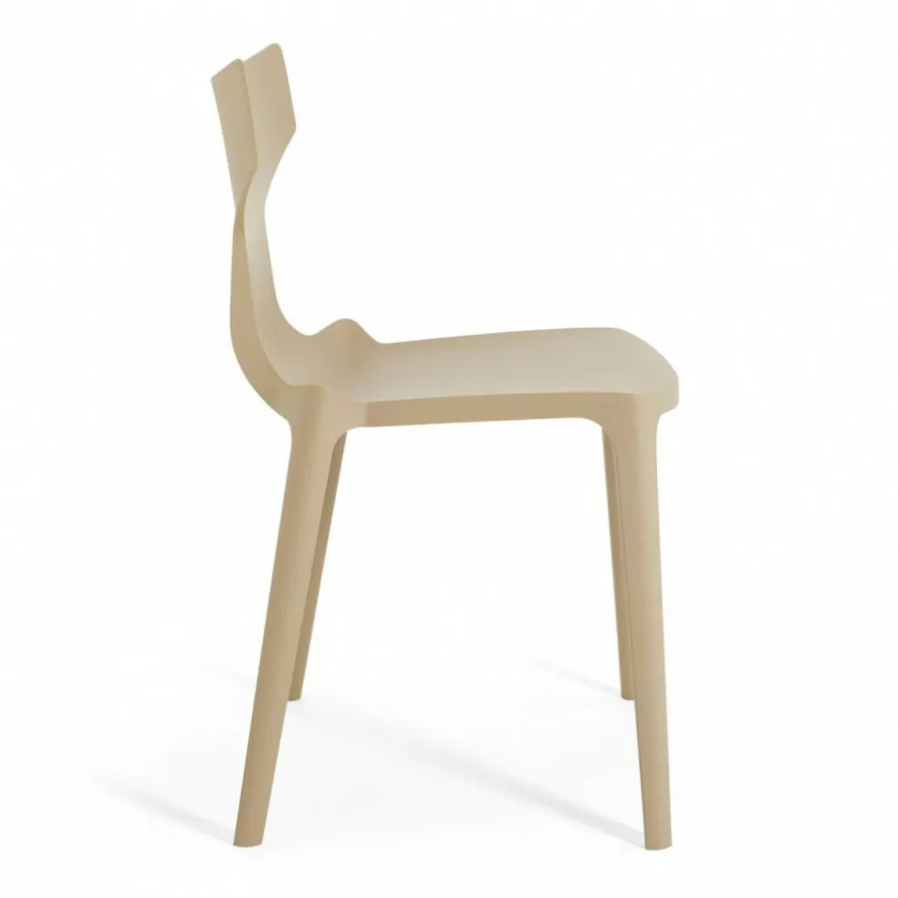 Beim Re-Chair kommt ausschließlich thermoplastisches Technopolymer, das mit mineralischen Zusätzen versehen ist, zum Einsatz. Diese Einheit in Form und Farbe verleiht dem Sitzmöbel sein charakteristisches Äußeres. Die vier leicht ausgestellten Beine gehen nahtlos in den bequem geformten Sitzbereich über. Von hier erhebt sich die Rückenlehne, die auch bei längerem Sitzen den Rücken optimal stützt. Das verwendete Material macht den Stuhl sehr pflegeleicht. Er kann mit einem Tuch leicht gereinigt werden und eignet sich sogar für den Außenbereich. Bis zu sechs Stühlen des Re-Chair können übereinander gestapelt werden. So lässt er sich leicht und platzsparend verstauen, sollte er einmal nicht gebraucht werden.