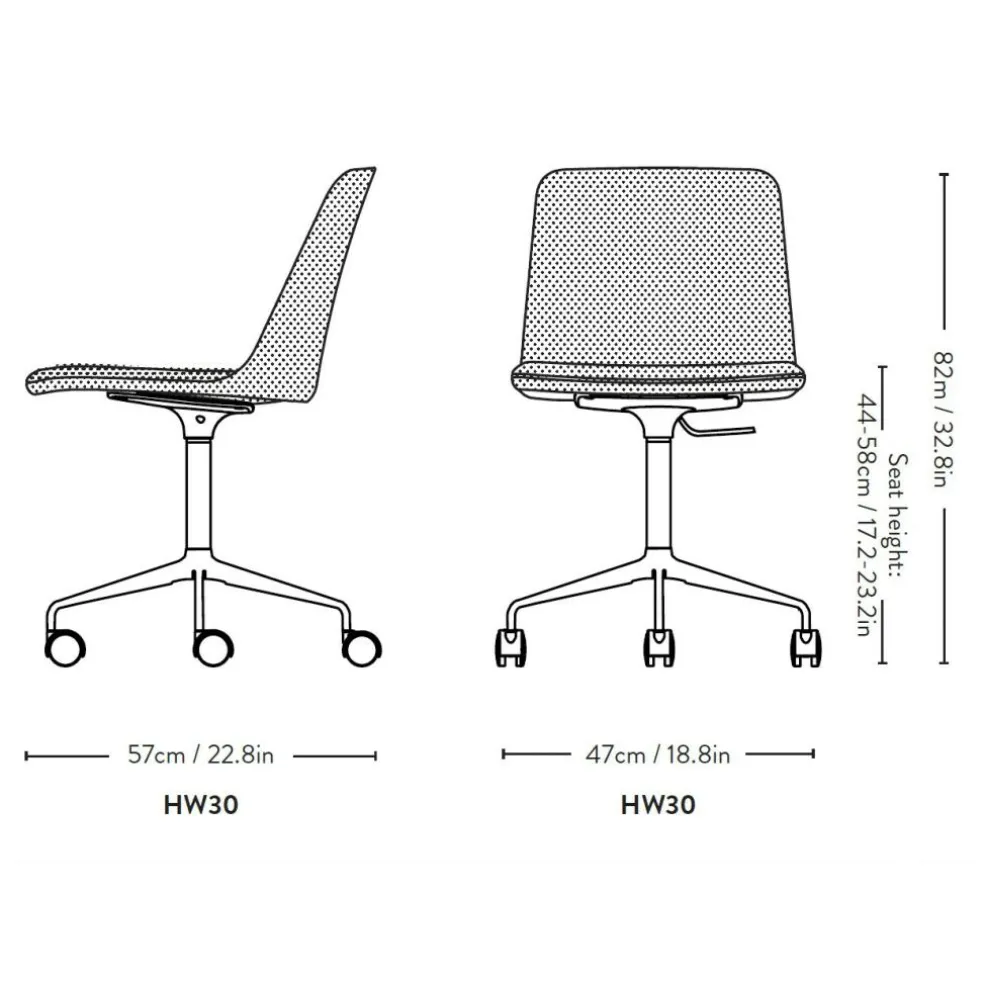 Der Rely HW30 Bürodrehstuhl ist insgesamt 82 cm hoch. Die Tiefe beträgt 57 cm und die Breite 47 cm. Das 9,4 kg schwere Möbelstück passt sowohl ins Büro als auch ins Home-Office. Dank der ergonomisch geformten Rückenlehne unterstützt er den Körper auch bei längerem Sitzen perfekt.