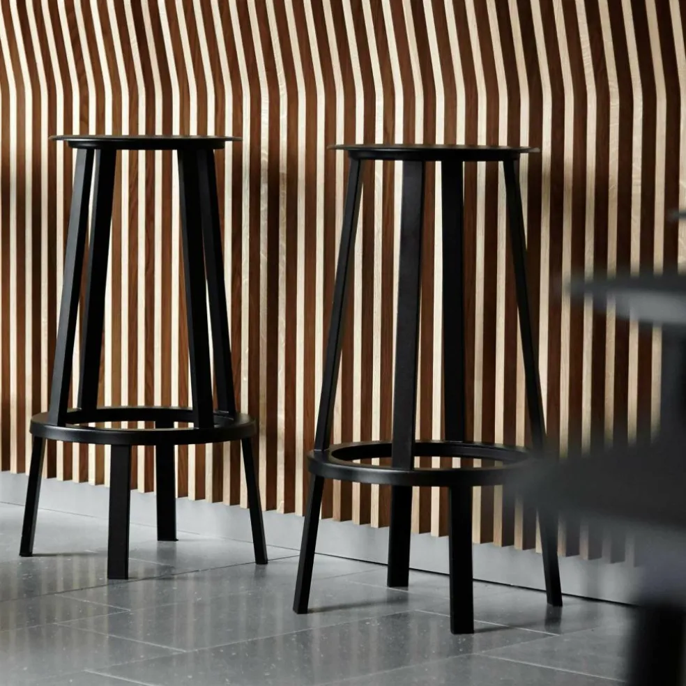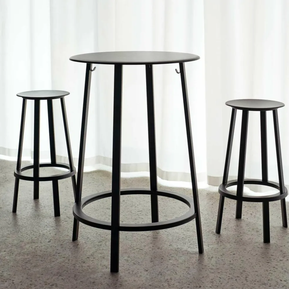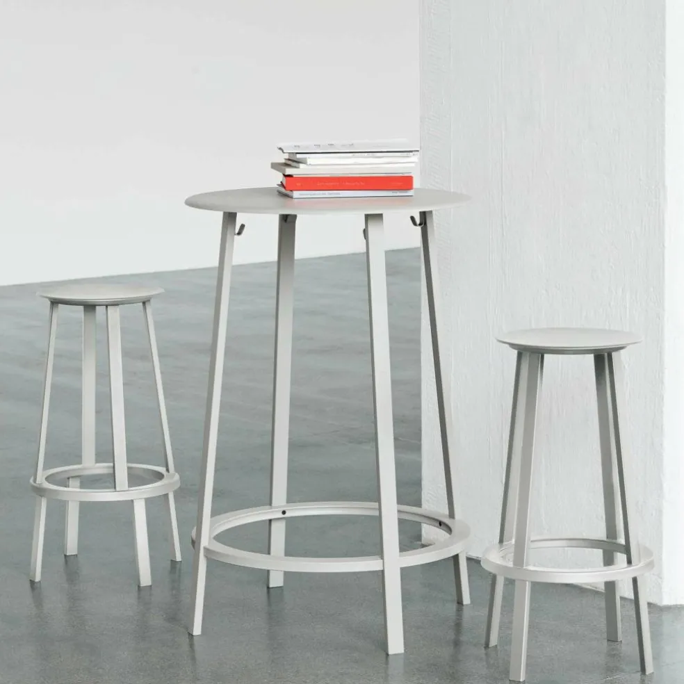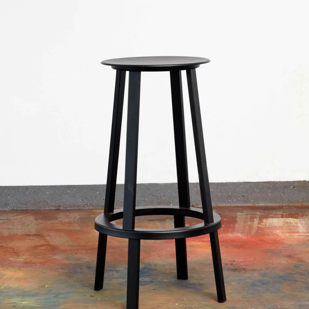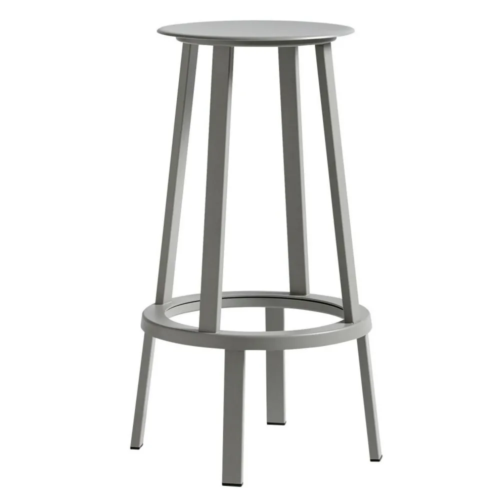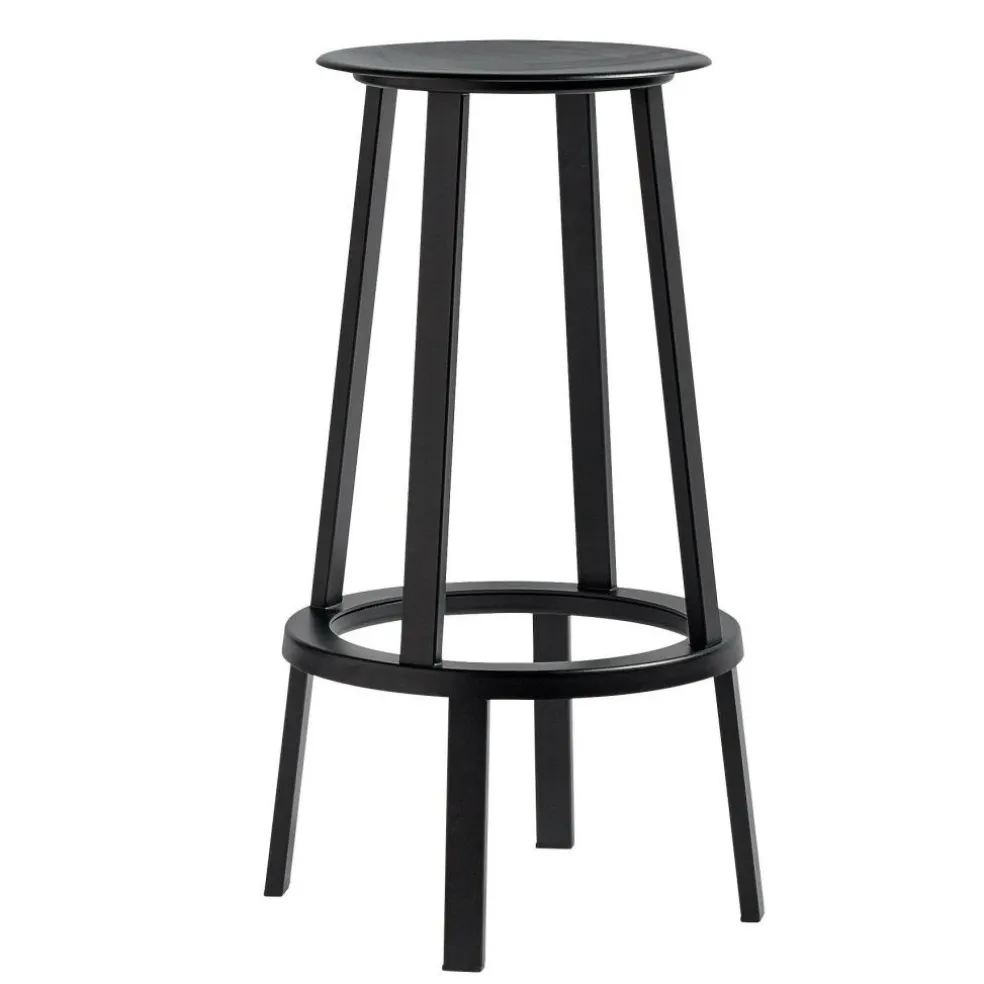 Der Revolver Stool Barhocker wurde vom Designer Leon Ransmeier für den Hersteller HAY kreiert. Der Stil dieser Möbel belebt die fünfziger und sechziger Jahre neu. Schlichte Eleganz ist das Markenzeichen von HAY und auch der Revolver Stool Barhocker zeichnet sich durch klare Linien und Einfachheit aus. Diverse Farben sorgen dafür, dass sich der Barhocker in feinster Abstimmung jeder privaten oder öffentlichen Bar anpasst. Dieser Barhocker wird in zwei verschiedenen Größen hergestellt: 65 und 76 cm Höhe. Der Durchmesser des tellerförmigen Sitzes beträgt immer 34 cm. Der Sitz erhielt in der Mitte eine Absenkung, wodurch ein komfortables Sitzen über einen längeren Zeitraum erreicht wird. Auf die rundum laufende Stange, die in perfekter Höhe angebracht wurde, können Sie Ihre Beine bequem ablegen. Das Highlight vom Revolver Stool Barhocker ist die Drehbarkeit von 360 Grad. Diese kleine Verspieltheit sorgte auch für den Namen dieses Barhockers. Vier Füße, die von oben nach unten auseinanderlaufen, lassen diesen Barhocker in jeder Situation fest und sicher auf dem Boden stehen. Als Material wurde pulverbeschichteter Stahl und Aluminium verwendet. Damit wurde die vom Hersteller berühmte Eleganz erreicht.