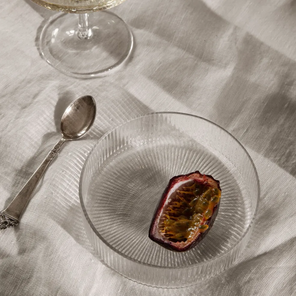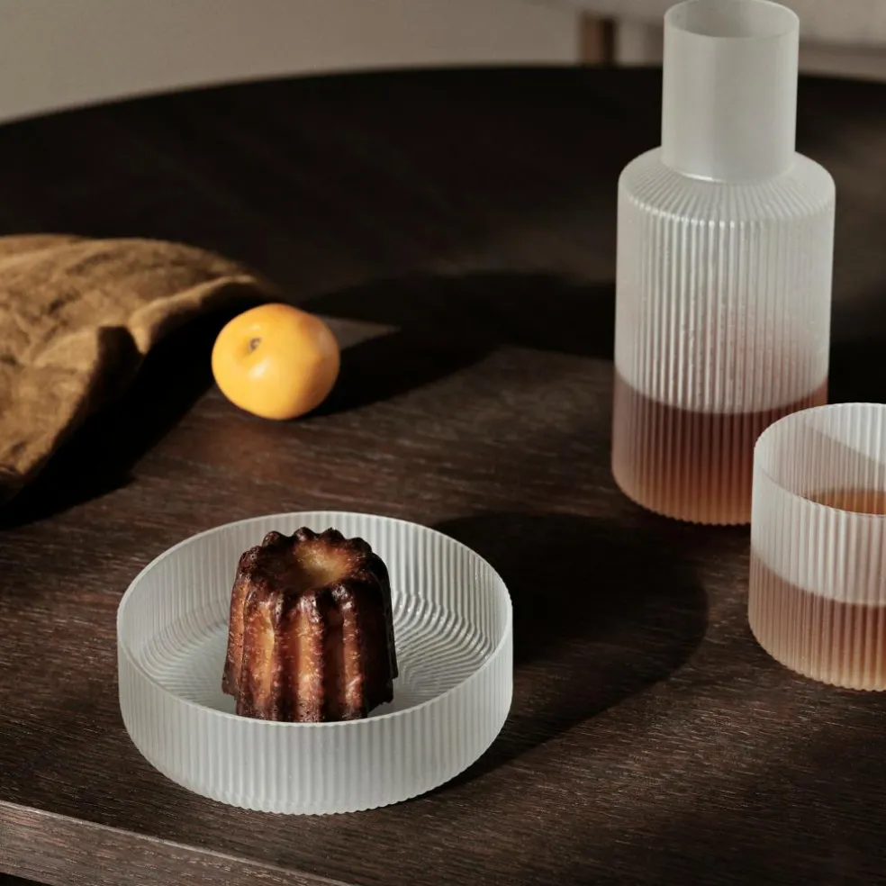 Das Ripple Servierschale 4er Set wurde für die Marke Ferm Living entworfen. Es gehört einem formschönen Glaswaren-Programm an, das durch ein einfaches geradliniges Design im Stil der 1920er-Jahre gekennzeichnet ist. Ihren Namen leiten die Ripple-Modelle von den fein geriffelten Glasoberflächen ab. Der präzisen Ausführung in hochwertiger Handarbeit verdanken sie ihren individuellen Charakter.