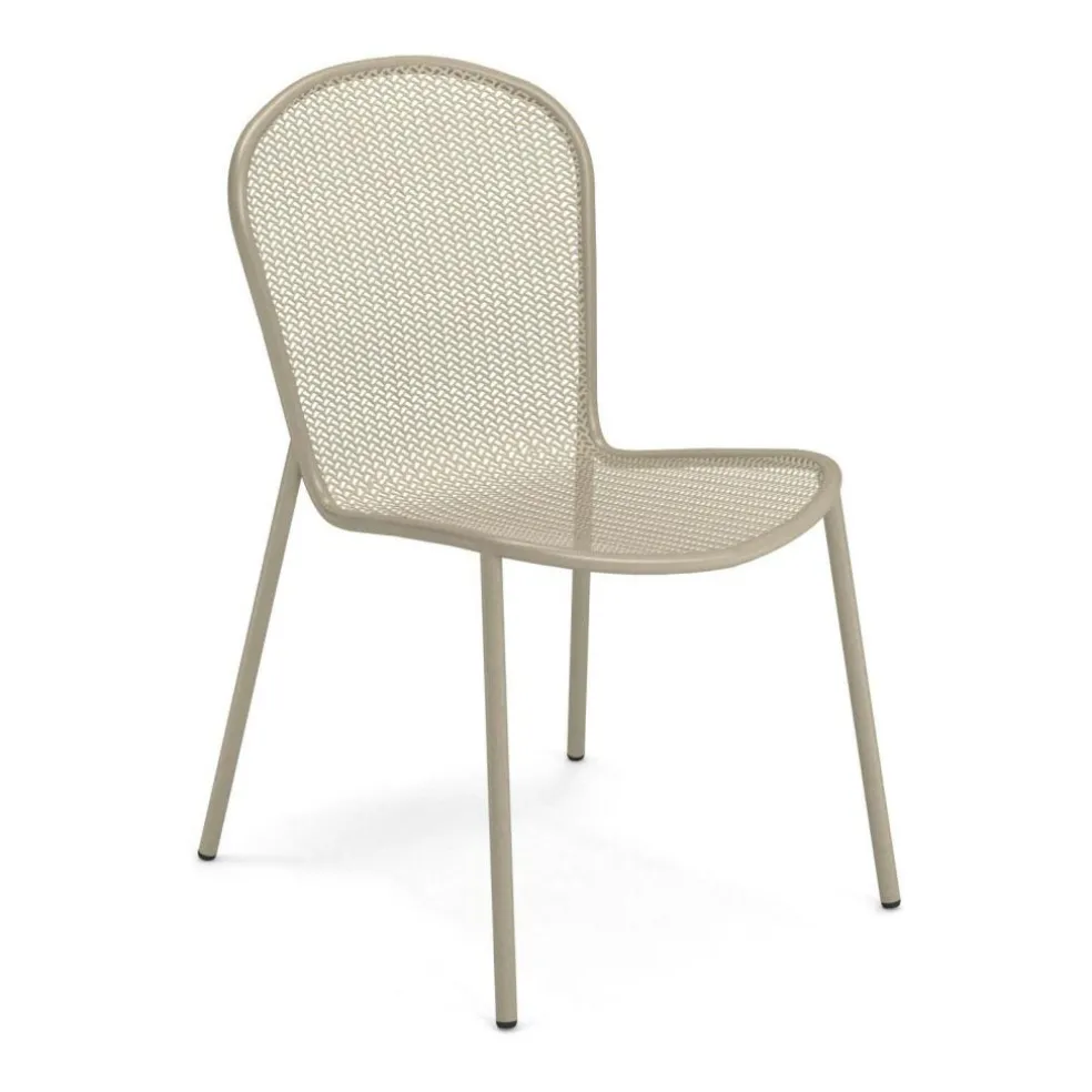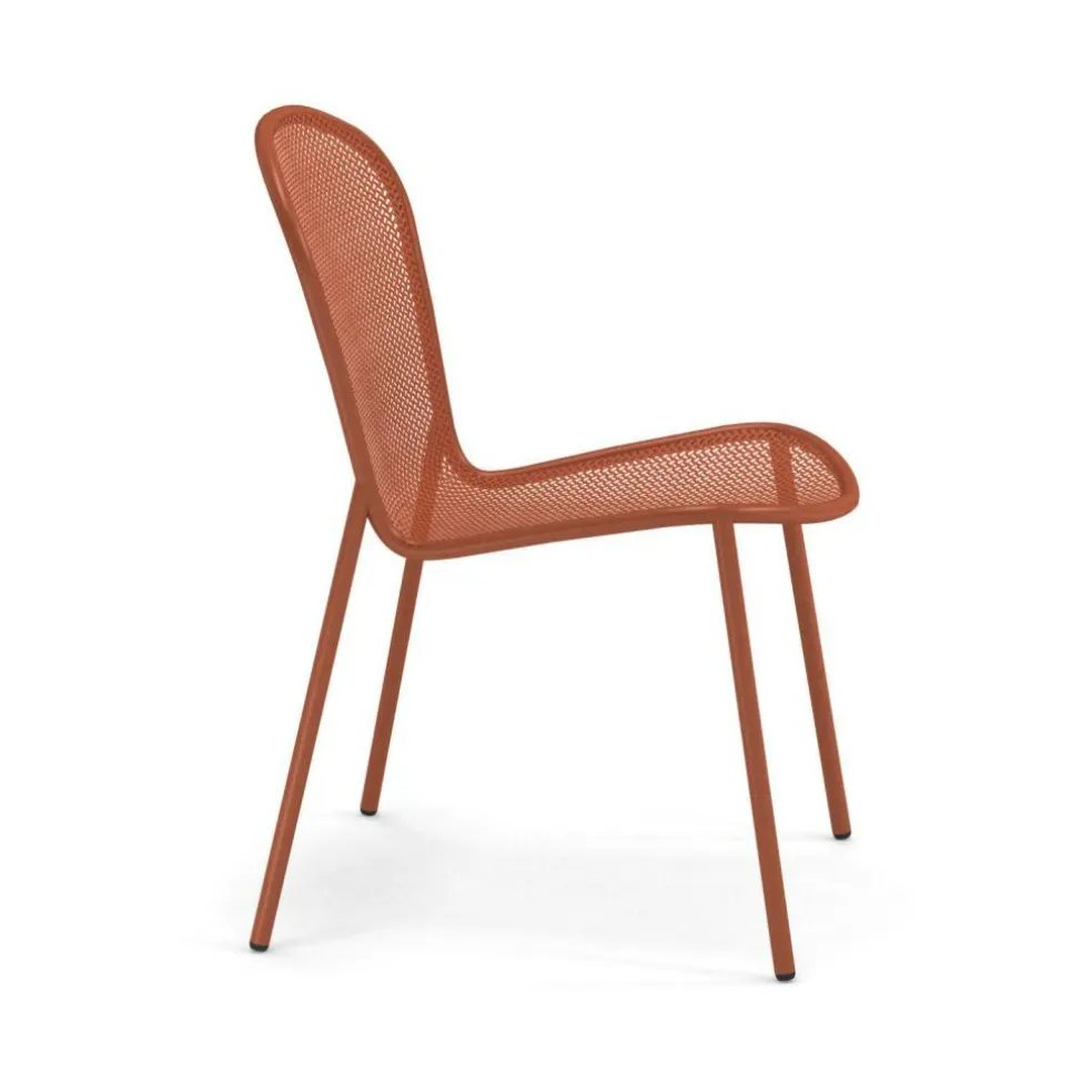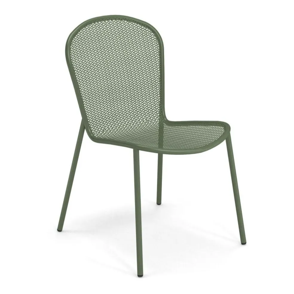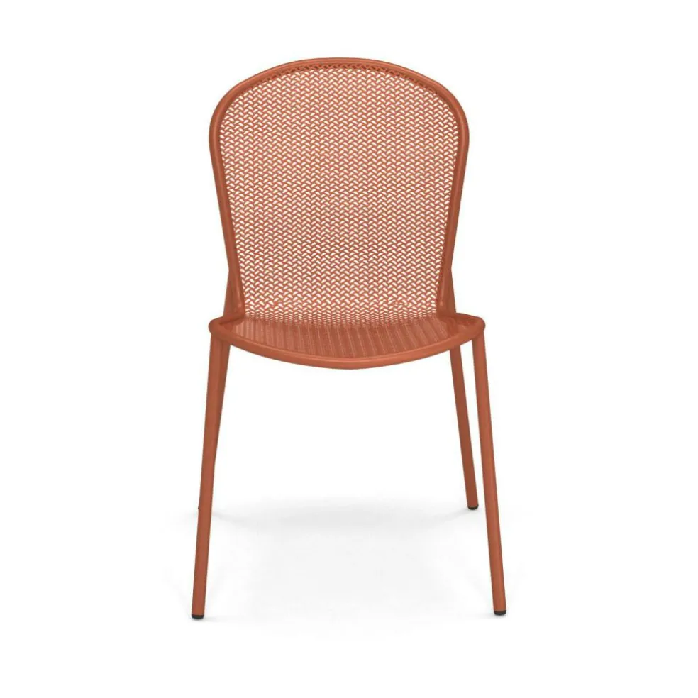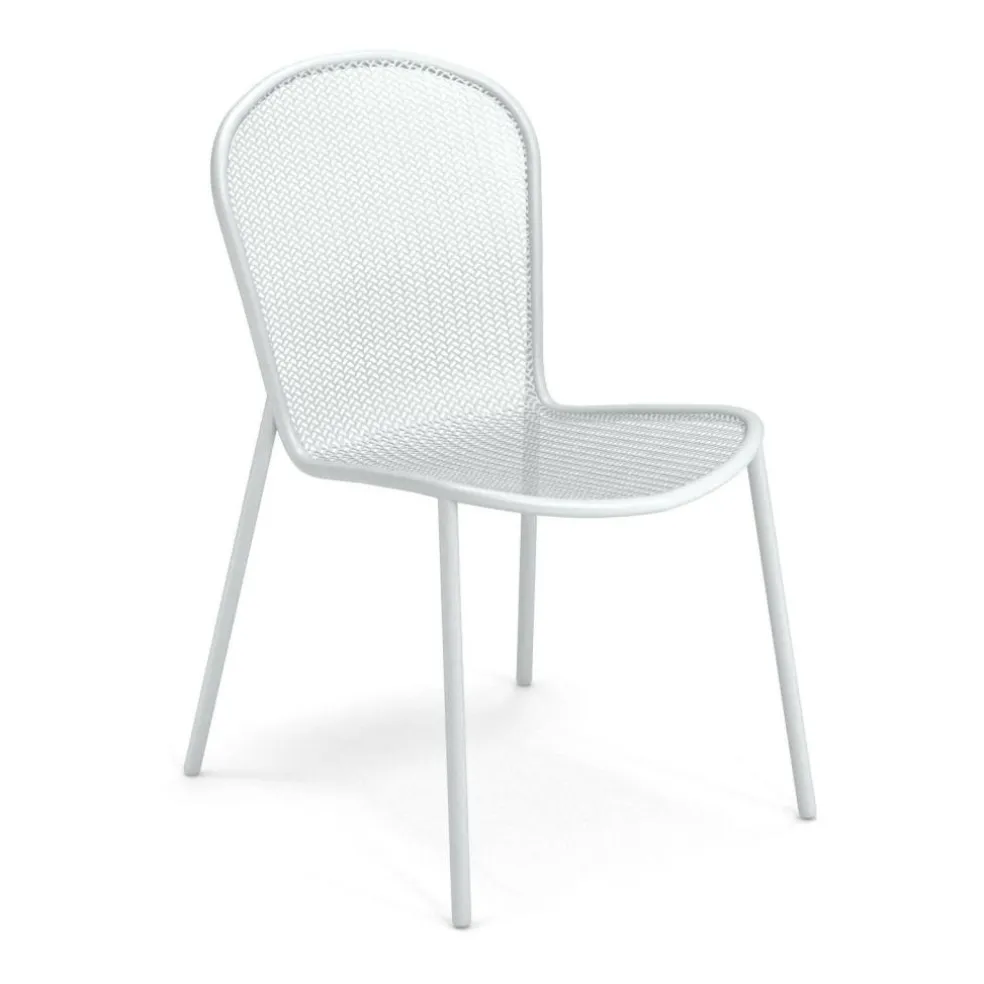 Der Name des Ronda XS Gartenstuhl geht auf die sanft gerundeten Kanten und die in einem Halbbogen geformte Rückenlehne zurück. Das Gestell aus pulverbeschichtetem Stahl sichert mit seinen vier leicht ausgestellten Stuhlbeinen sicheren Halt. Darauf ist eine Sitzschale montiert. Die Sitzfläche und Rückenlehne sind aus einem Guss gefertigt. Verwendet wird dafür auffallendes Lochblech, das wie ein grob gewebtes Textil wirkt. Erstklassigen Sitzkomfort zeichnet den Ronda XS Gartenstuhl aus.