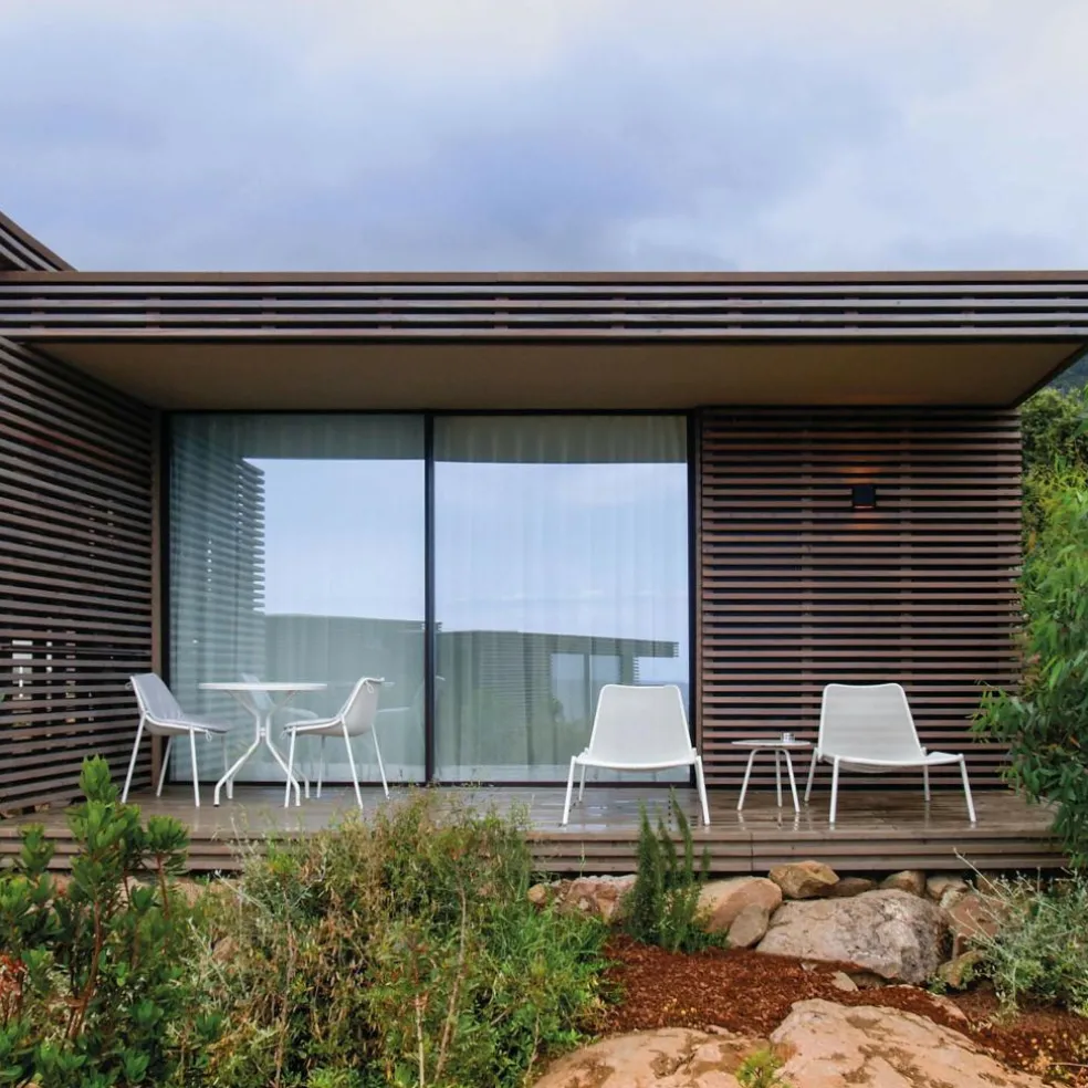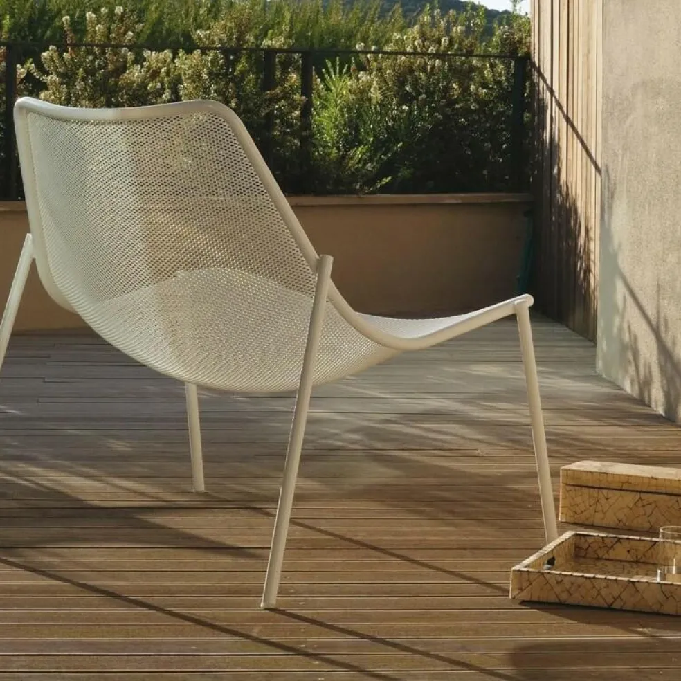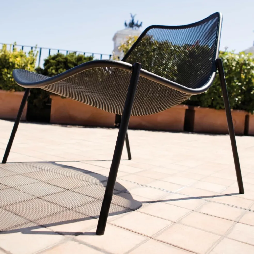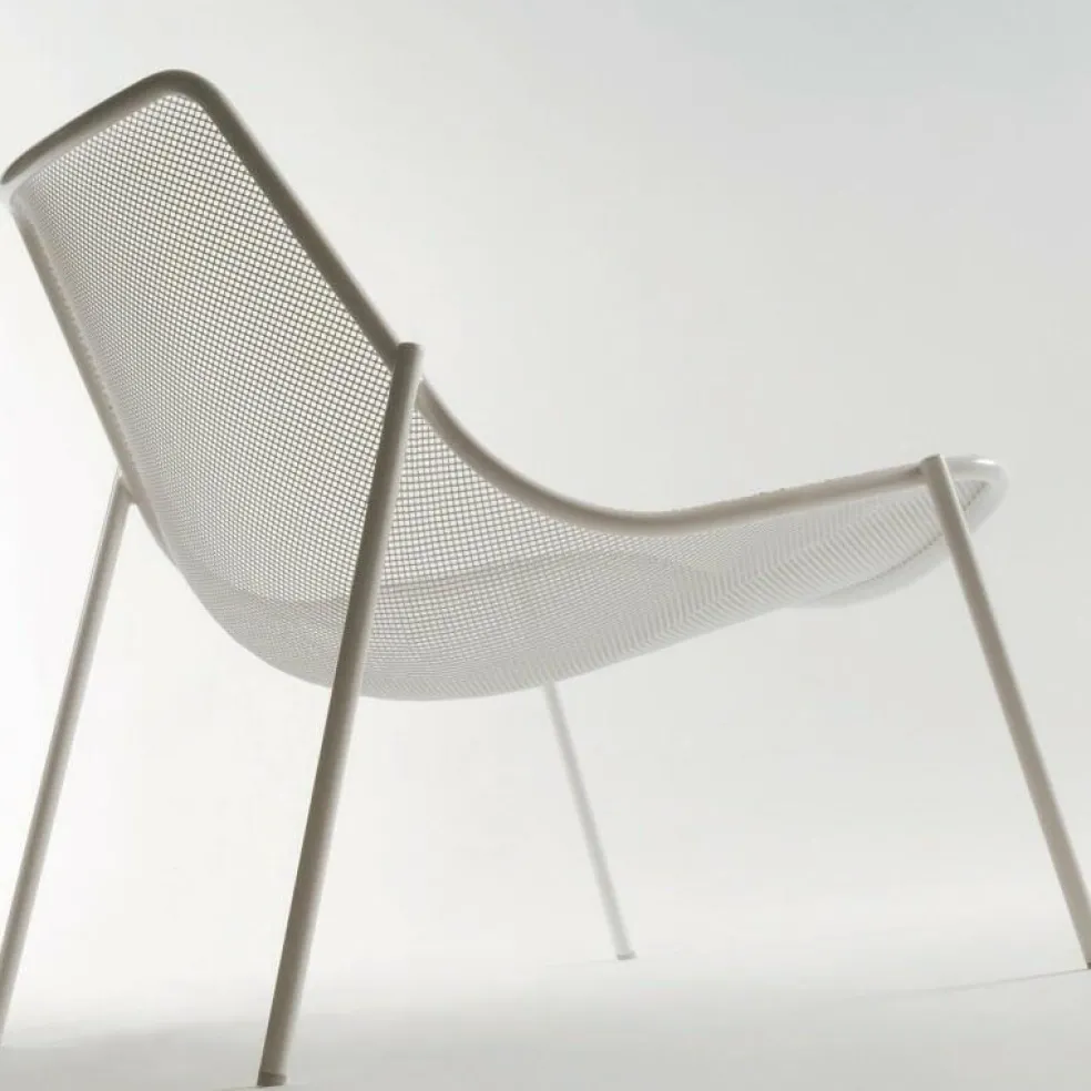 Mit seiner großzügigen Sitzschale wirkt der Round Lounge-Gartensessel wie eine Einladung, entspannt Platz zu nehmen. Sie ist aus dünnem Metall geformt und fein gelocht, sodass der Untergrund zart durchscheint. Daneben treten die schlanken linearen Beine dezent in den Hintergrund. Deren Stellung ist so geneigt, dass sie das Gewicht des nach hinten abfallenden Sitzes optimal aufnehmen können. Damit zeichnet sich der Round Lounge-Gartensessel durch seine hohe Robustheit aus. Er ist aus pulverbeschichtetem Stahl gefertigt, was ihn auch witterungsbeständig macht. Der schicke Sessel passt auf die Terrasse, an den Pool, in ein Atrium oder mitten in die Wiese und eignet sich ebenso für ein Straßencafé oder den privaten Garten.