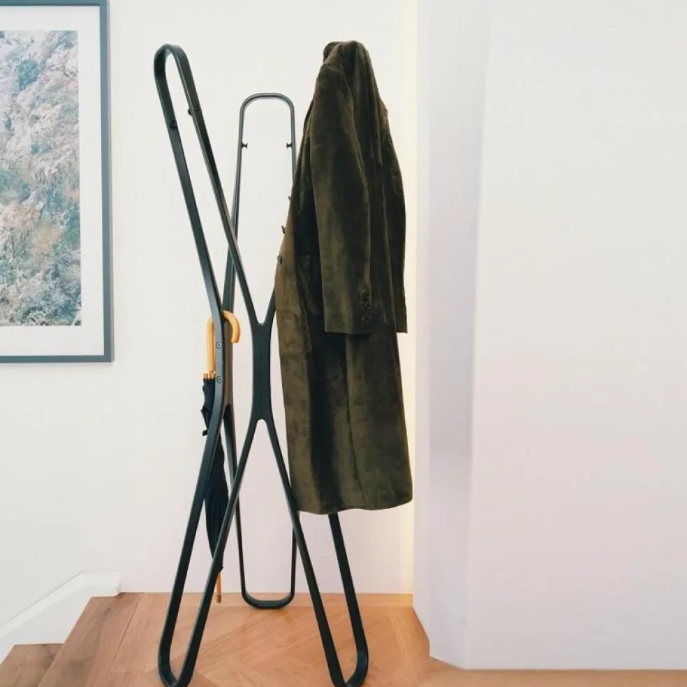 Die beiden Designer haben uns diesen Saturn Garderobenständer präsentiert, der in seiner geschwungenen Formgebung – sie erinnert im abstrakten Sinne an den Planeten Saturn erinnert – einzigartig ist und sich in jedem modernen Eingangsbereich wunderbar in Szene setzen lässt.