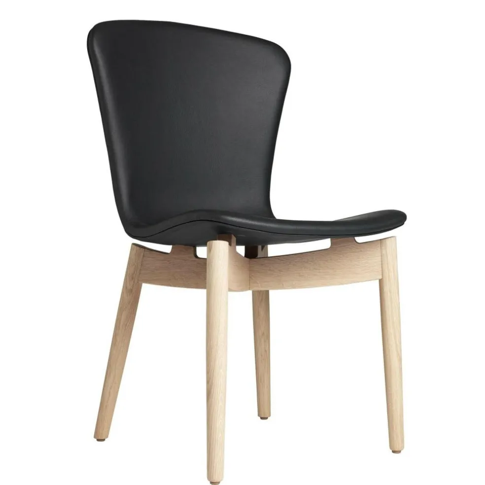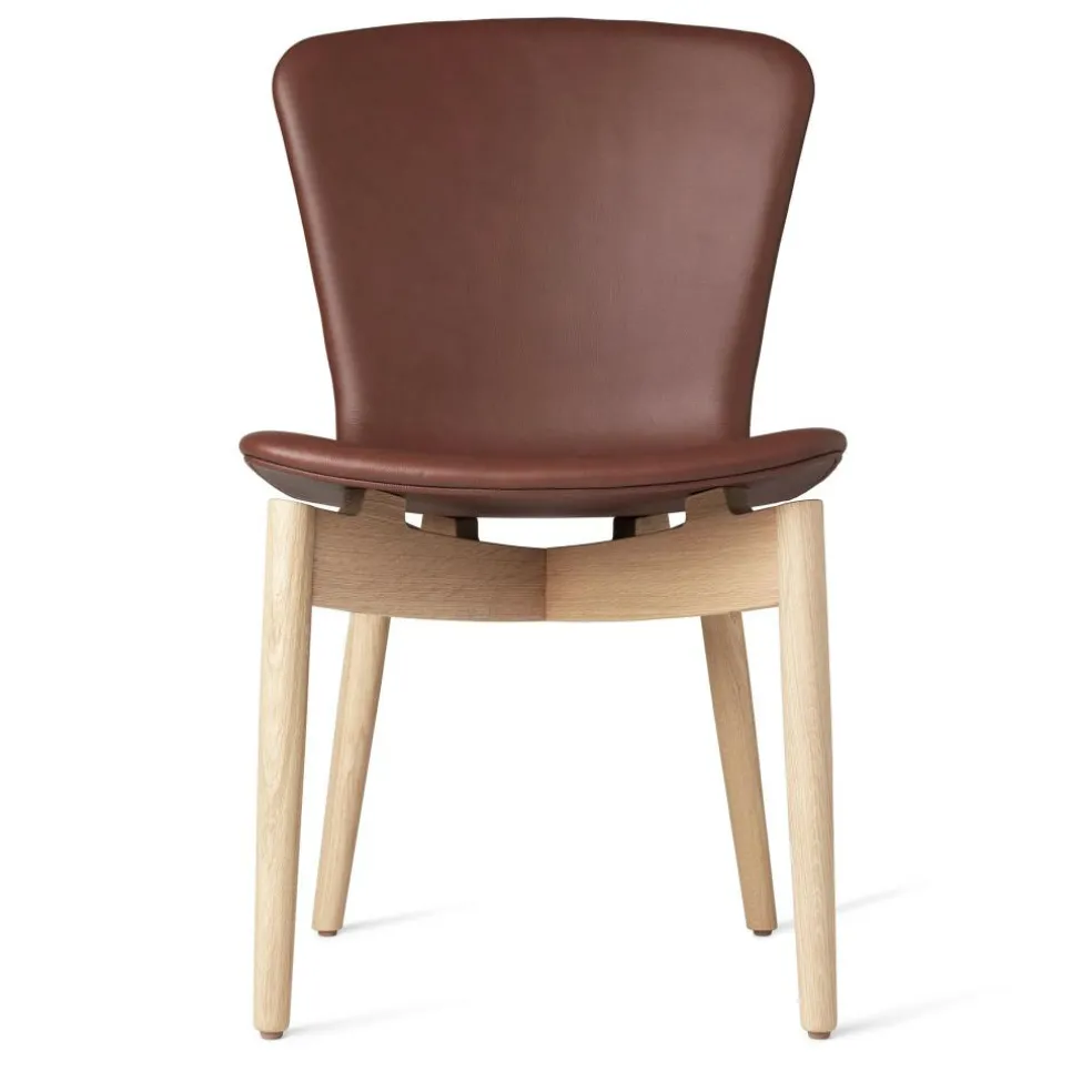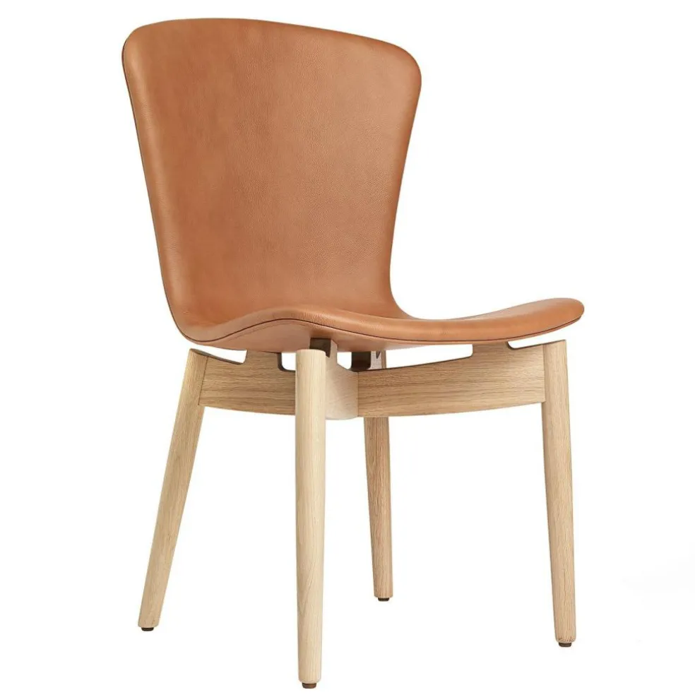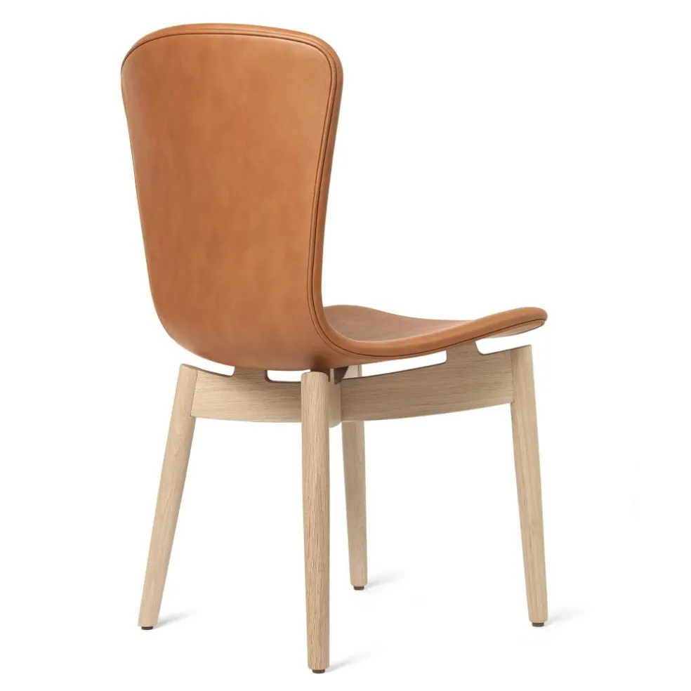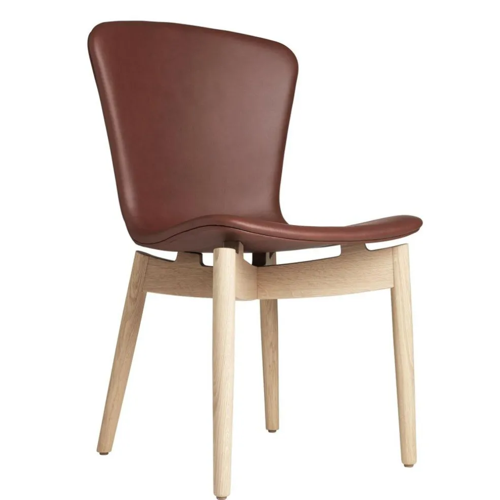 Eine dynamisch geschwungene Schale kennzeichnet den Shell Stuhl Gestell Eiche matt lackiert. Sie fasst die ergonomisch geformten Flächen von Sitz und Lehne in einem Stück zusammen. Ihre Ränder sind großzügig abgerundet. Die obere Kante der Rückenlehne ist ebenso wie die vordere Stuhlkante ausladend breit. Mit ihrem Bezug aus edlem Leder verspricht die Schale des Stuhls Wärme und Gemütlichkeit. Für einen stabilen Stand sorgt der Unterbau aus lackiertem Eichenholz. Massive Streben verbinden die ausgestellten Stuhlbeine. Sie laufen kreuzförmig direkt unter dem Sitz in einer ebenso gebogenen Form zusammen und nehmen diesen in vier Punkten auf. Die strapazierfähigen Materialien und die robuste Konstruktion machen diesen Designstuhl zu einem langlebigen Sitzmöbel, das im Ensemble mit anderen Shell-Stühlen oder als Solitär in das private Wohnzimmer passt und sich auch für Restaurants oder Hotels eignet.