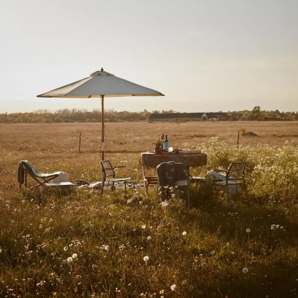 Besondere Erwähnung verdient zudem die clevere Konzeption des Sonnenschirms: Skagerak hat eine Entlüftungsvorrichtung eingebaut, die bei hohen Temperaturen einem Hitzestau unter dem Schirm vorbeugt. Sein großzügiges Maß von 300×300 cm bietet ausreichend Schatten.