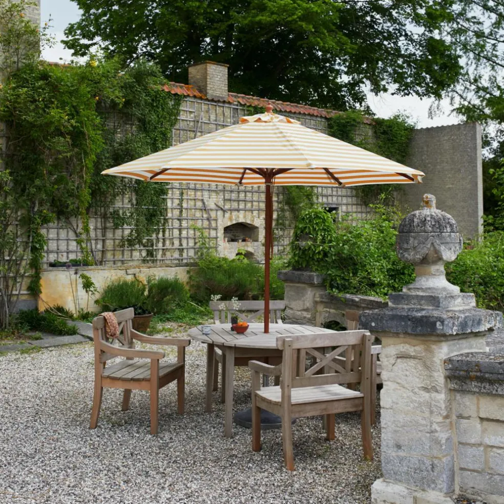 Die Optik dieses formschönen Sonnenschirms erinnert an das Segel eines Bootes oder asiatische Schirme. Das Holz und der weiße Stoff ergeben einen maritimen Look, der zum Relaxen einlädt. Dieser hochwertige Schirm vervollständigt Ihre Gartenmöbel auf der Terrasse und dient als stilvoller Schattenspender.