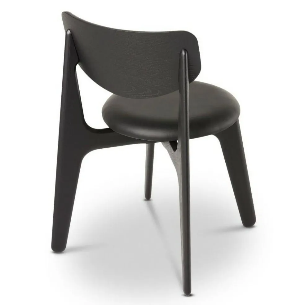 Mit unverwechselbarem Design zeichnet sich der Slab Stuhl gepolstert aus. Die vier Beine stehen nicht gerade, sondern schräg zueinander. Die hinteren Beine gehen in einem Stück in die Rückenlehne über. Sie ist an der Oberkante gerade und an der Unterseite rund geschnitten. Das Gestell wird aus hochwertigem Eichenholz hergestellt. Einen interessanten Kontrast dazu bildet die runde Sitzfläche. Zum hervorragenden Sitzkomfort des Stuhls trägt eine weiche Polsterung aus CMHR-Schaum bei. Sie ist mit edlem Leder überzogen. Die Designer ließen sich von der stattlichen Erscheinung von Bullen inspirieren. Daher wirkt das Design kraftvoll und maskulin.