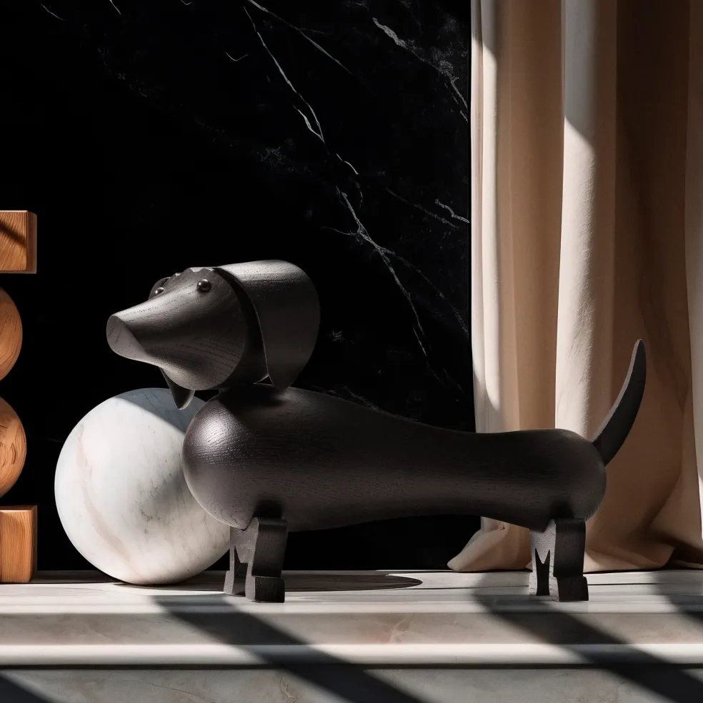 Die Special Edition Holzfigur Hund wurde von Kay Bojesen für die Marke Kay Bojesen Denmark entworfen. Der dunkle Dackel gilt als dänische Designikone, die 2024 ihren 90. Geburtstag feiert und nur zum Anlass des Jubiläums produziert wird.