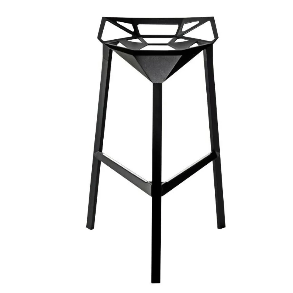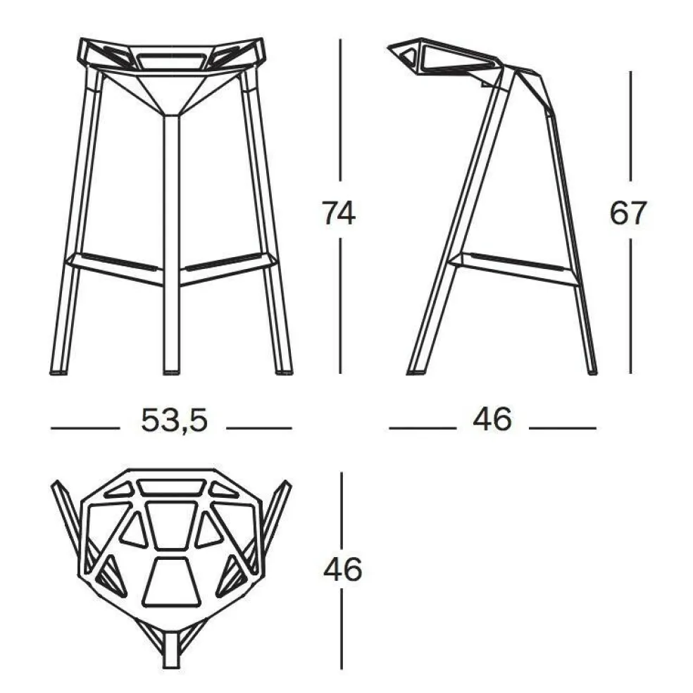 Wer ein modernes Möbelstück für die Hausbar, ein Restaurant oder den Küchentresen sucht, trifft mit dem Stool One Hocker eine ausgezeichnete Wahl. Er steht sicher auf drei Beinen, die jeweils an zwei Seiten mit einer Querstrebe verbunden sind. Darauf können die Füße bequem abgestellt werden. Die Sitzfläche und die niedrige Rückenlehne des Stool One Hockers sind aus Streben zusammengesetzt. So entsteht ein interessantes geometrisches Muster. Der Sitz ist aus Aluminium-Druckguss gefertigt, der eine Oberflächenbehandlung mit fluoriertem Titan und eine Polyesterlackierung erhält. Deswegen ist der stapelbare Stool One Hocker auch für den Außenbereich geeignet. Die Beine bestehen aus eloxiertem und polyesterlackiertem Profilaluminium.
