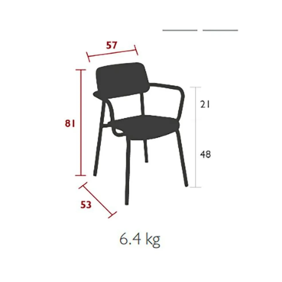 Der Studie Gartenarmlehnstuhl ist 57cm breit und 53cm tief. Er hat eine Sitzhöhe von 48cm. Seine Armlehnen erreichen eine Höhe von 69cm. Die Höhe des Designstuhls beträgt 81cm. Er wiegt 6,4kg. Bis zu sechs Modelle können übereinandergestapelt werden, was einer Stapelhöhe von 108cm entspricht. Der Studie Gartenarmlehnstuhl ist in verschiedenfarbigen Ausführungen erhältlich. Alternativ gibt es auch ein Studie-Modell ohne Armlehnen.