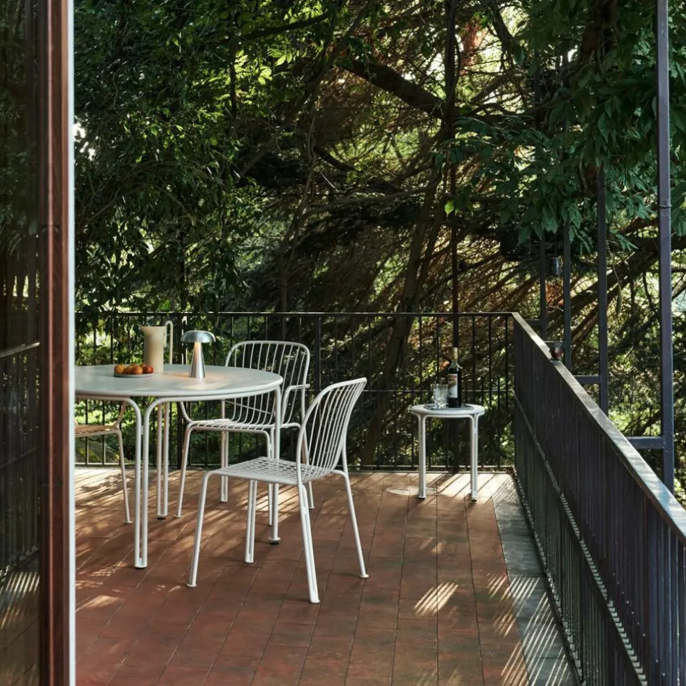 Ein Netz aus schlanken Gitterstäben bildet den Sitz dieses formschönen Designstuhls, der mit seinem ergonomischen Schwung ein angenehmes Sitzgefühl verspricht. Der Rahmen besteht aus vier gebogenen Rundstangen, deren Enden jeweils ein Beinpaar bilden, sodass sich jedes Stuhlbein aus einer Doppelstütze zusammensetzt. Diese raffinierte Konstruktion macht den Thorvald SC94 Gartenstuhl zu einem attraktiven Hingucker. Daneben beeindruckt der Schattenwurf der filigranen Stuhlelemente. Hergestellt aus robustem Stahl und mit einer matten Pulverbeschichtung versehen, besticht der Designstuhl mit seiner langlebigen Witterungsbeständigkeit. Er macht sich ebenso gut auf einer Terrasse wie in einem Wintergarten und kann auch mitten in der Wiese stehen. So passt er in ein Straßencafé, auf eine Hotelterrasse oder in den privaten Hausgarten.