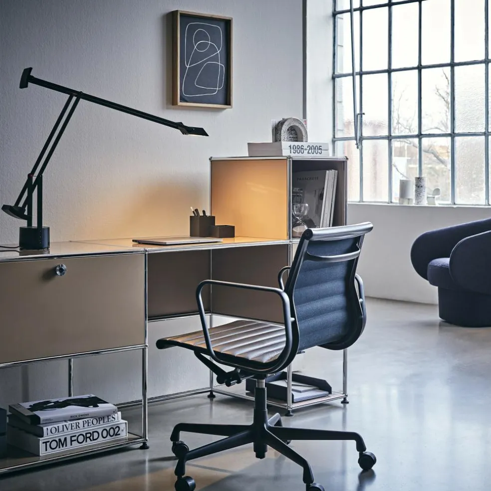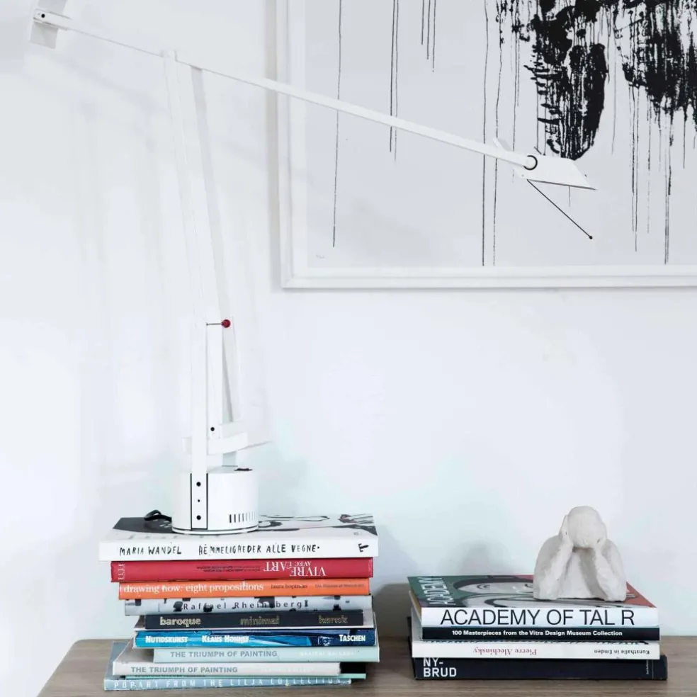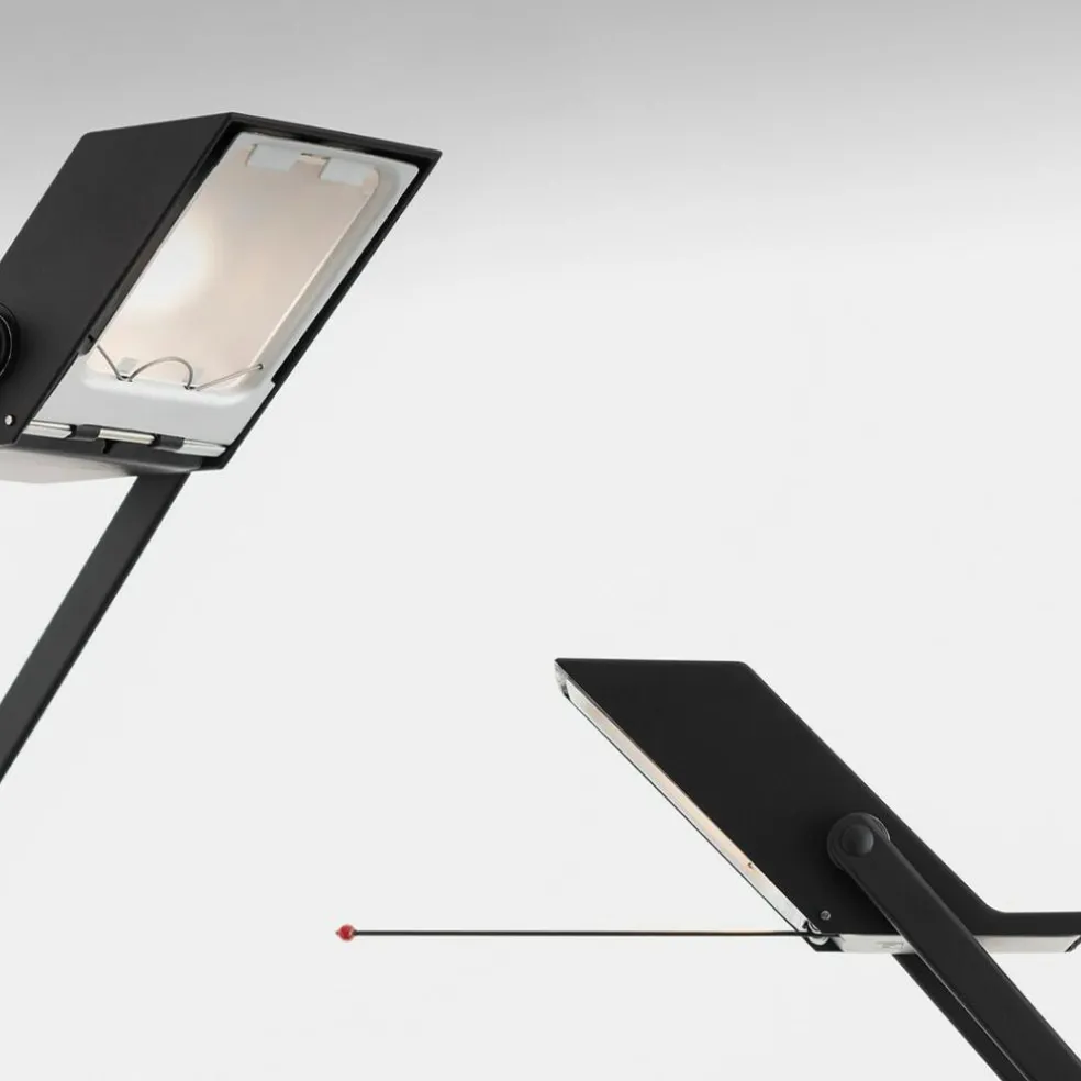Mit ihrem kleinen Fuß und dem schmalen Leuchtenkopf ist die Tizio Schreibtischleuchte eine platzsparende Arbeitsplatzbeleuchtung, deren Licht sich ganz einfach positionieren lässt. Denn ihr Arm weist zwei Gelenke auf, die ein Verstellen sowohl in der Höhe bis 119cm als auch in der Breite bis 108cm möglich machen. So gibt sie ein angenehmes, weißes Licht, das die Arbeitsfläche je nach Einstellwinkel exakt ausleuchtet. Praktische Gegengewichte sorgen in jeder Position für eine ausreichende Stabilität. Die Designleuchte besteht aus lackiertem Polycarbonat und einem Leuchtenschirm aus Aluminium. Damit passt die Tizio Schreibtischleuchte nicht nur in die moderne Werkstatt oder ins Büro, sondern auch auf den Schreibtisch daheim.
