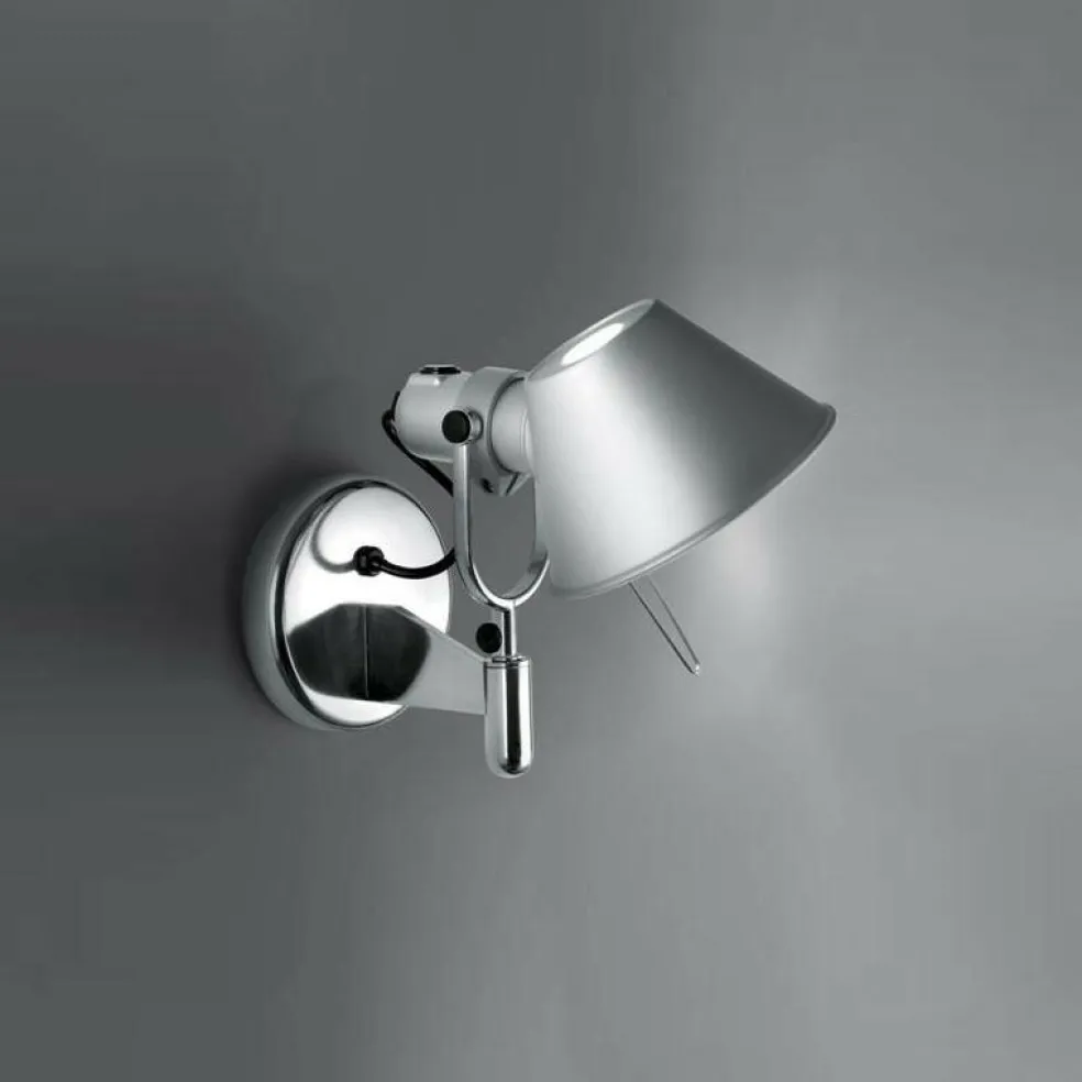 Der Name der Tolomeo-Serie erinnert an den bekannten griechischen Mathematiker und Astrologen Ptolemäus, der während der Antike lebte. Das Design der Tolomeo Faretto Wandleuchte reduziert sich auf wesentliche Elemente, nämlich eine Halterung und einen Schirm. Die Wandhalterung ist aus glänzendem Aluminium gefertigt. Zwischen Gestell und Leuchtenschirm ist ein Gelenk montiert. Es macht den Kopf schwenkbar. Der Lichtstrahl der Tolomeo Faretto Wandleuchte kann so individuell gelenkt werden. Dabei hilft ein kleiner Hebel, der an der Unterseite des Schirms befestigt ist. Der Lichtstrahl wird nach unten weitergeleitet, etwas Licht dringt auch durch eine runde Aussparung an der Oberseite des Leuchtenkopfs aus. Der konische Schirm besteht aus matt eloxiertem Aluminium. Der Kippschalter ist im Leuchtenkopf integriert.