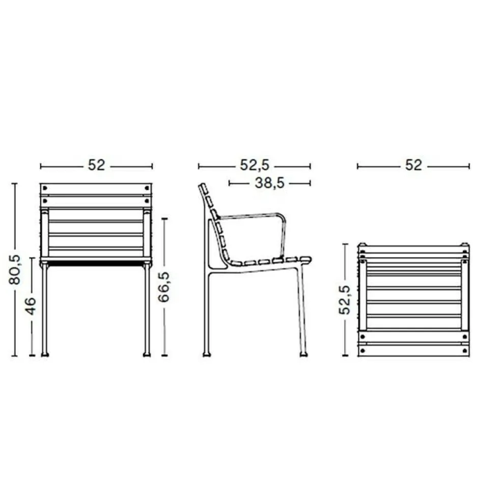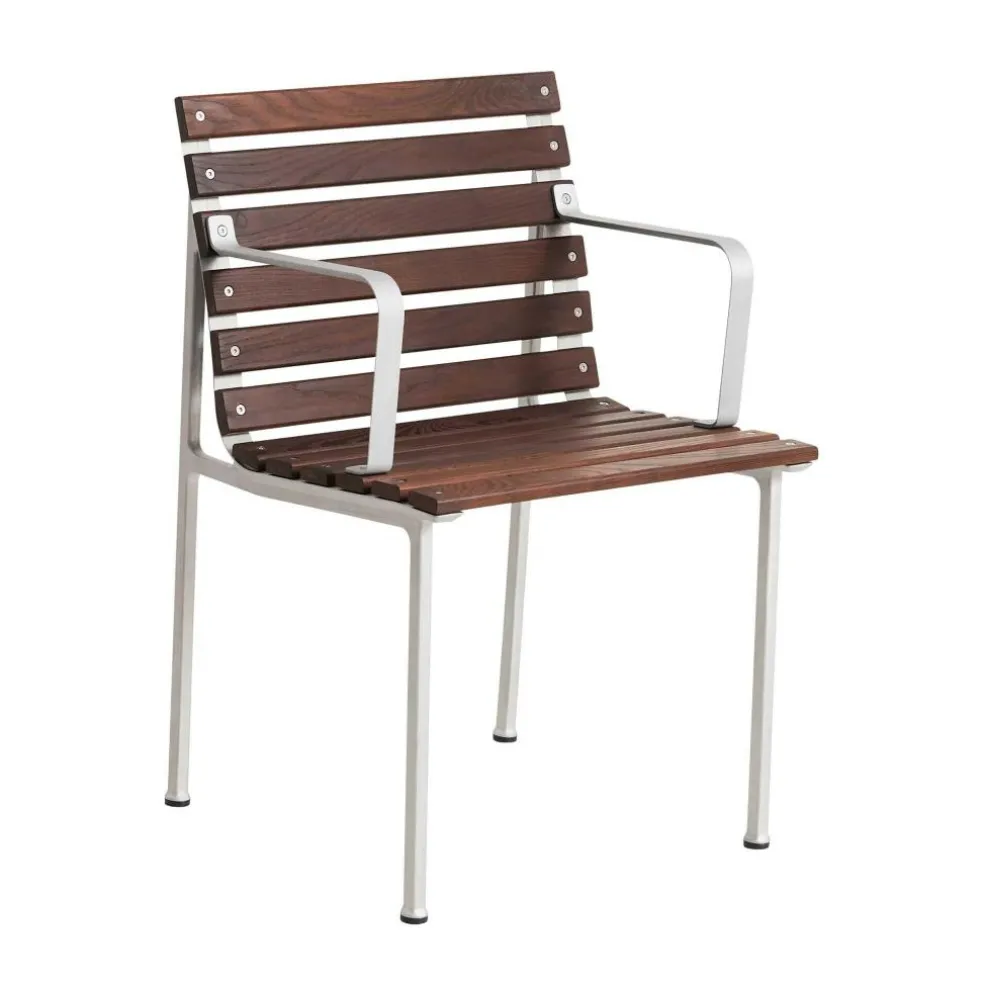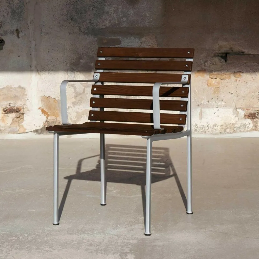 Besonders auffällig sind die flachen Aluminiumarmlehnen, die dem Traverse Gartenarmlehnstuhl nicht nur Struktur und Komfort verleihen, sondern auch seinen unverwechselbaren Charakter prägen. Sie rahmen die Silhouette mit grafischer Schärfe und geben dem Möbelstück eine fast architektonische Präsenz. Mit einer Sitzhöhe von 46 cm sowie einer Gesamthöhe von 80,5 cm bietet der Stuhl aufrechte Bequemlichkeit – ideal für lange Abende am Tisch, im Garten oder auf der Terrasse. Seine Breite von 52 cm und das stabile, doch ausgewogen proportionierte Gewicht von 9 kg sorgen für angenehme Standfestigkeit, ohne die Leichtigkeit der Form zu verlieren. Die Sitzfläche und Rückenlehne bestehen aus massivem Eschenholz, das durch ein natürliches Thermoverfahren gegen äußere Einflüsse wie Feuchtigkeit und Sonneneinstrahlung geschützt ist. Mit der Zeit verändert sich die Oberfläche und entwickelt eine silbrige Patina – ein geplanter Alterungsprozess, der dem Stuhl Würde und Tiefe verleiht. Die plattierten Armlehnen aus druckgegossenem Aluminium setzen dazu einen kühlen, matten Kontrast und unterstreichen die sachliche Eleganz des Designs. Gefertigt wird der Traverse Gartenarmlehnstuhl aus nachhaltigen Materialien – das Holz stammt aus FSC®-zertifizierter Forstwirtschaft, das Aluminium besteht zum Teil aus recyceltem Ursprung. Die Aluminiumteile sind kugelgestrahlt und mit einem klaren Outdoor-Lack versiegelt, der die rohe Materialität betont und gleichzeitig schützt.