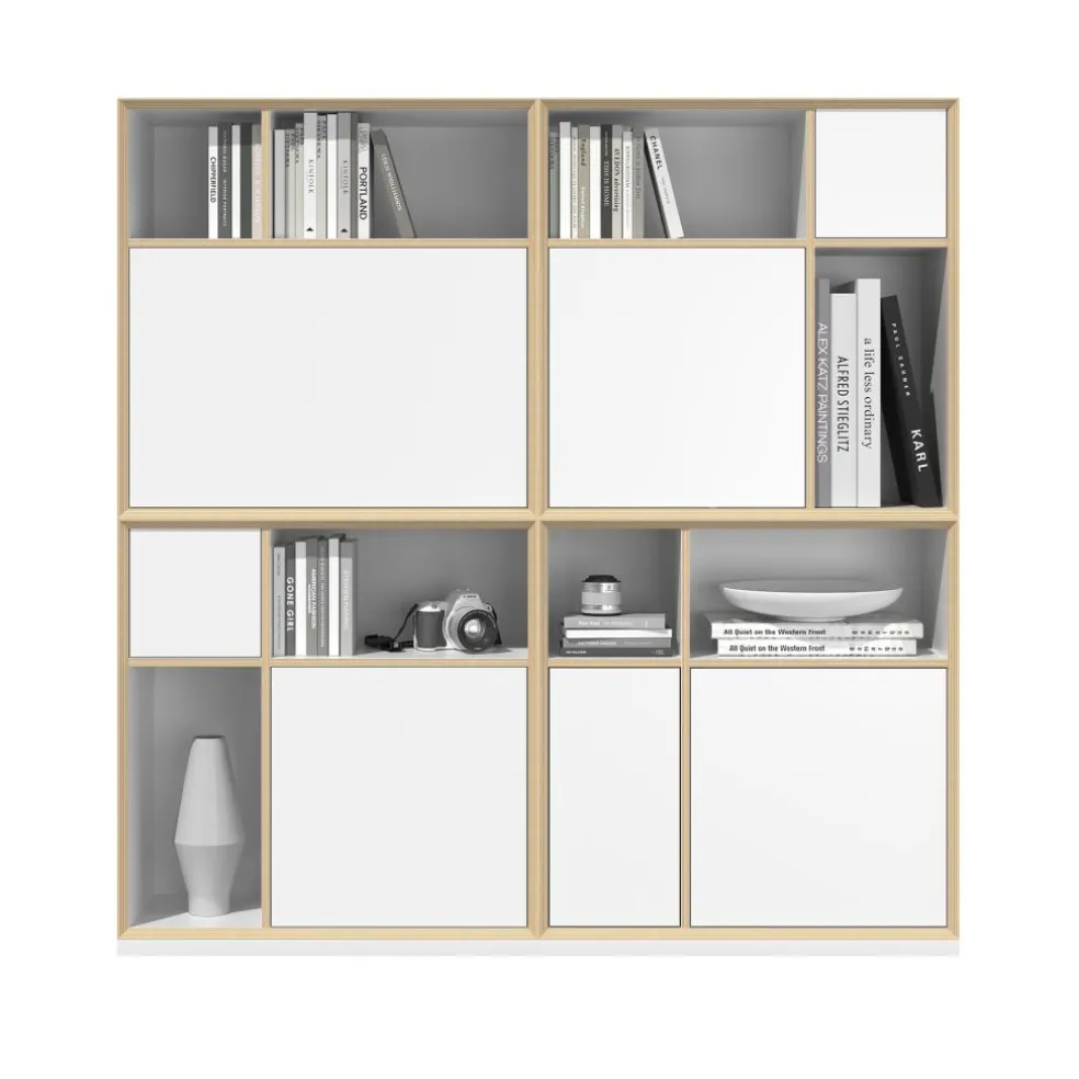 Mit seinen annähernd quadratischen Abmessungen ist das Vertiko Ply Kombination 8 Standregal nicht nur ein geräumiges Aufbewahrungsmöbel. Es lässt sich auch perfekt zur Wandgestaltung in großen Räumen einsetzen. Die Attraktivität der Regalkombination liegt dabei in den vier symmetrisch angeordneten Regalmodulen, die eine ähnliche Gliederung aufweisen, sich aber dennoch von den benachbarten Elementen unterscheiden. Eine Einteilung in quadratische und rechteckige Felder schafft dabei ein harmonisches Gesamtbild. Glatte, grifflose Türen und eine Klapptür, die sich über Drücken öffnen lassen, bilden flächige Elemente, während die offenen Regalfächer Tiefe erzeugen. Die naturfarbenen Holzkanten bilden einen farblichen Kontrast. Hergestellt aus regional produziertem Birkenschichtholz ist das Vertiko Ply Kombination 8 Standregal ein nachhaltiges Designstück, das in eine Praxis, ein Büro sowie ins private Wohnzimmer passt.