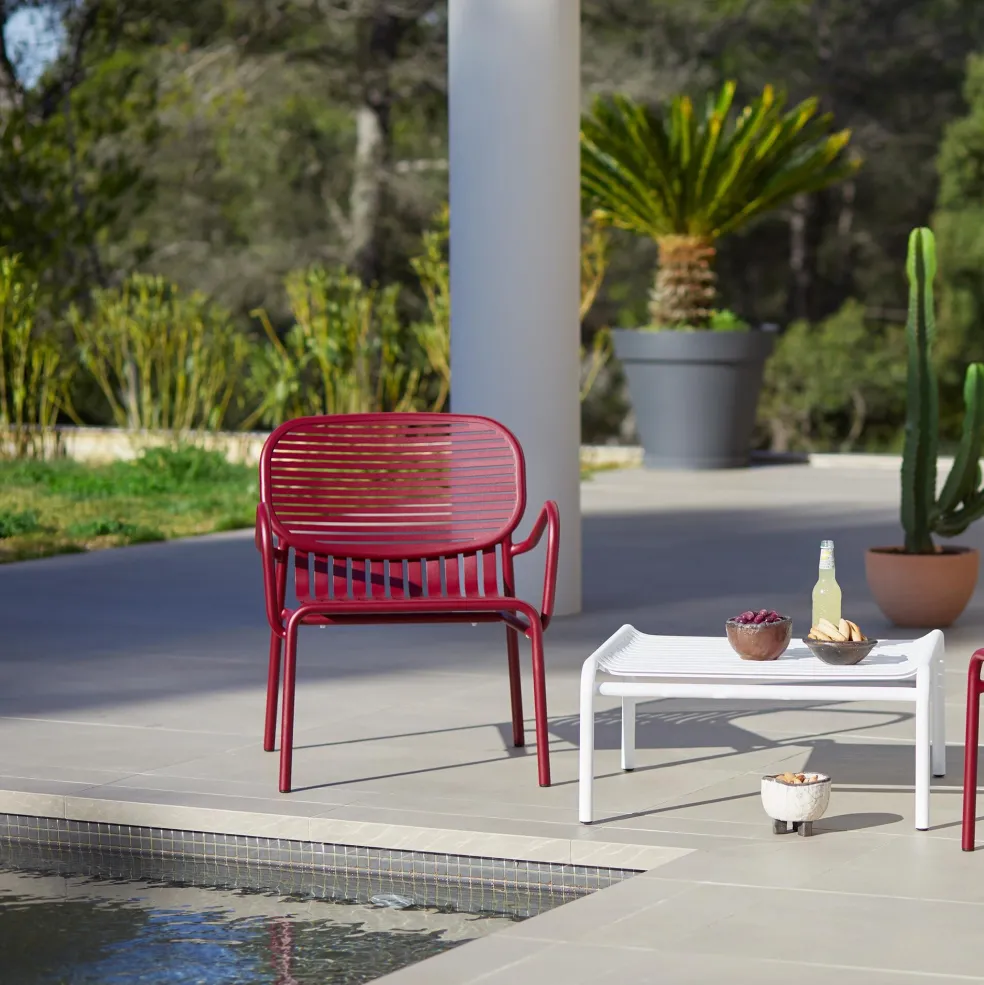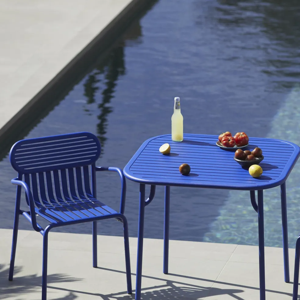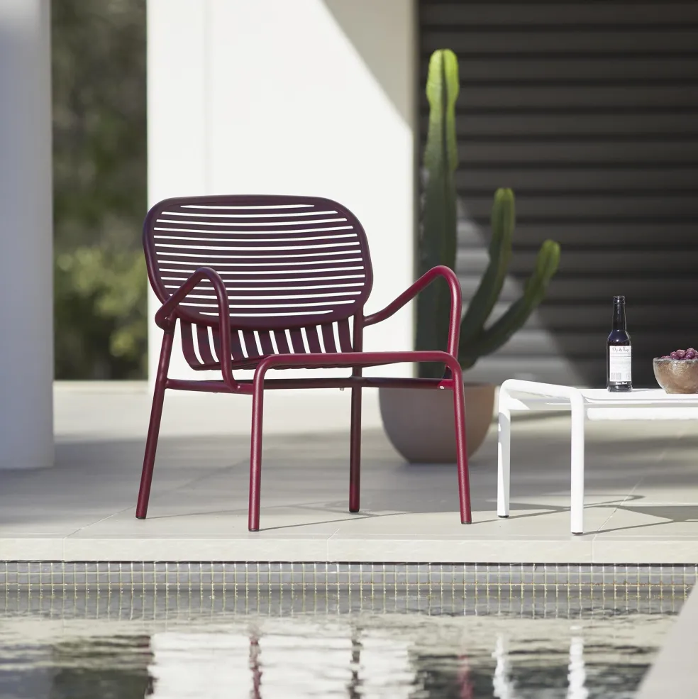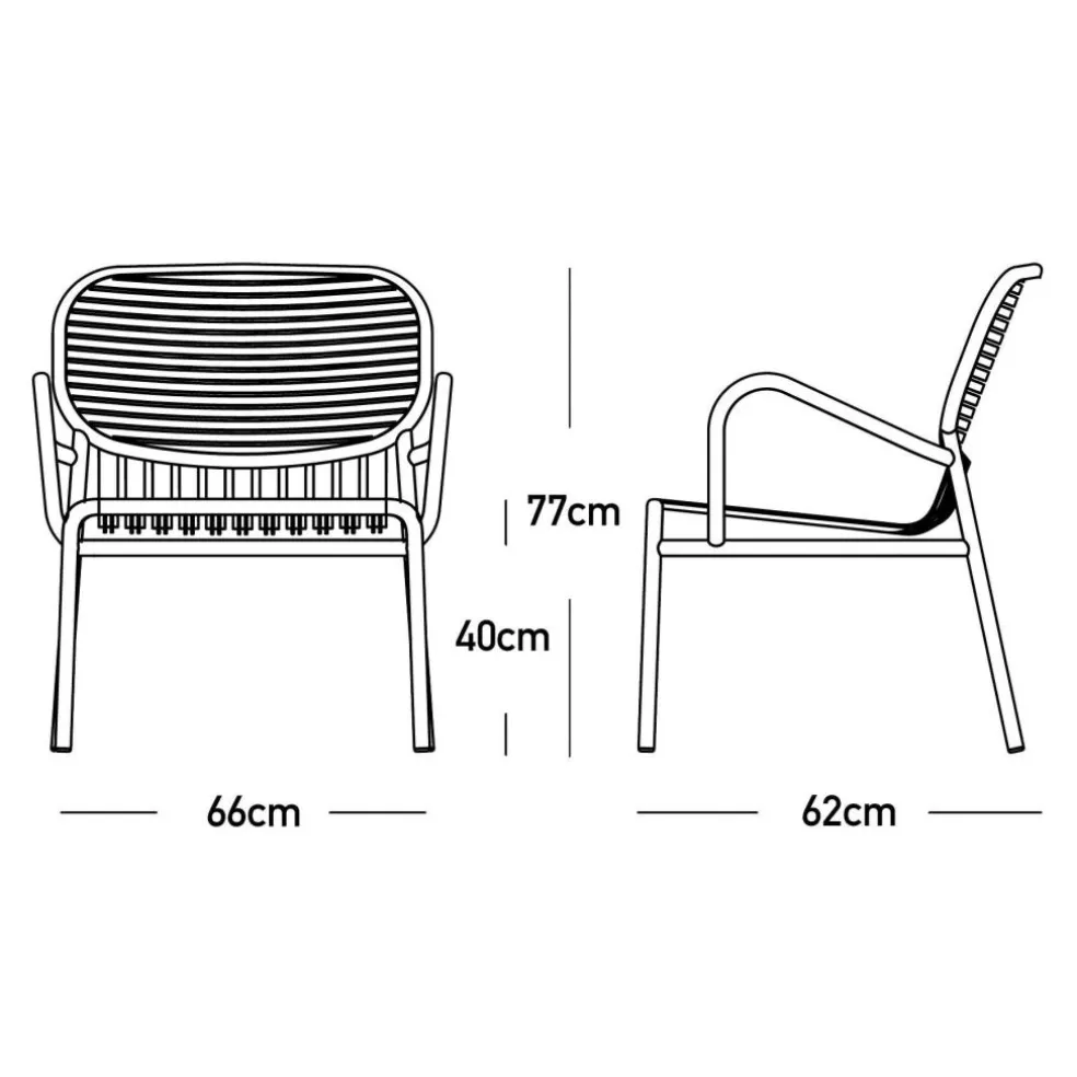 Den formschönen Week-End Gartenarmlehnstuhl gibt es in fröhlichen sowie frechen Nuancen aus gekörnter Epoxidfarbe, wie Ultramarinblau und Matt-Bordeaux oder in den Klassikern Schwarz und Weiß. Mit einer bequemen Sitzhöhe von 40 cm und den praktischen Abmessungen von 66 cm Breite, 77 cm Höhe und 62 cm Tiefe sowie einer Armlehne mit 62 cm und einer Rückenlehne mit 77 cm ist dieser stylishe Stuhl ein verlässlicher und attraktiver Begleiter auf der Terrasse, dem Balkon oder neben dem Pool in Ihrem Garten.