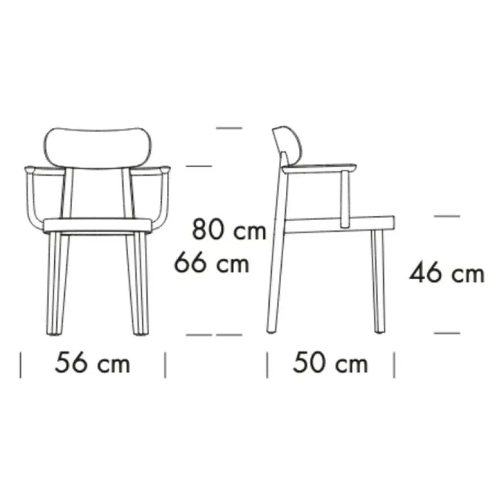 Der 118 MF Armlehnstuhl mit Muldensitz hat ein Gewicht von 5 kg. Die Höhe der Armlehnen beträgt 66 cm. Das Modell ist 56 cm breit bei einer Höhe von 80 cm. Der 118 MF Armlehnstuhl mit Muldensitz ist 50 cm tief. Er hat eine Sitzhöhe von 46 cm. Passend zum Modell kann man Filz- oder Kunststoffgleiter bestellen.