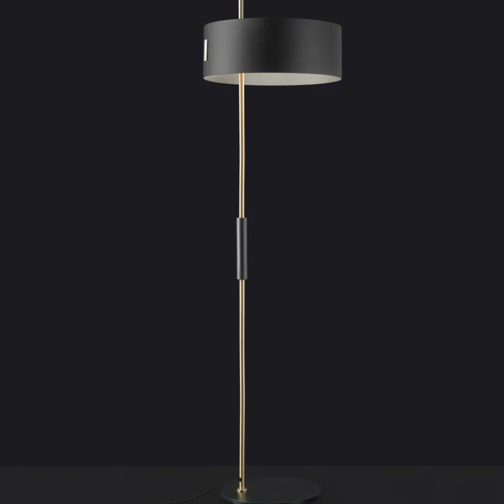 Die 1953/343 Stehleuchte zeichnet sich durch klare Linien und schlichte geometrische Formen aus: Der runde, dünne Fuß ist genauso wie der Leuchtenschirm in dunkler Farbe gehalten. Einen ansprechenden Kontrast dazu bildet ein filigraner goldglänzender Stab, der die beiden Elemente miteinander verbindet. Die Oberseite des Leuchtenschirms schmückt eine Reflektorabdeckung, die in satiniertem Edelmetall gehalten ist. Das Gestell durchdringt den Leuchtenschirm und überragt ihn um einige Zentimeter. Perfekt ist die 1953/343 Stehleuchte für die Zonenbeleuchtung im Wohnzimmer geeignet. Hier verbreitet sie an einem gemütlichen Fernsehabend oder beim Lesen stimmungsvolles Licht. Mögliche Einsatzgebiete sind auch das Homeoffice und das Büro. Da im der 1953/343 Stehleuchte ein Dimmer im Textilkabel integriert ist, lässt sich die Helligkeit individuell regeln.