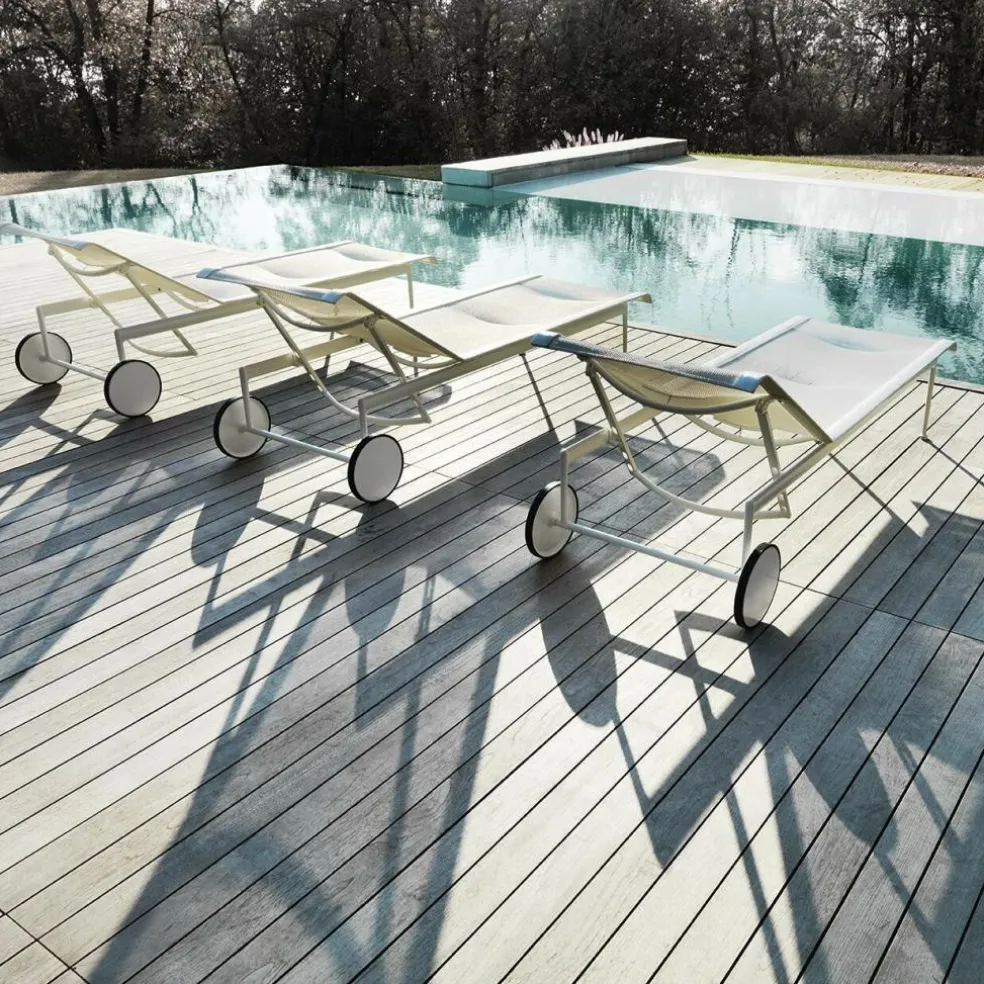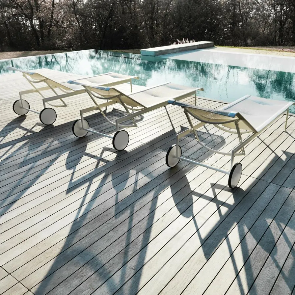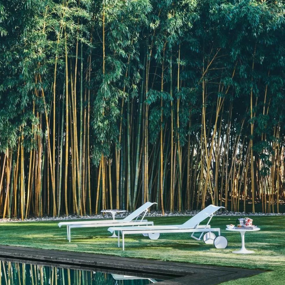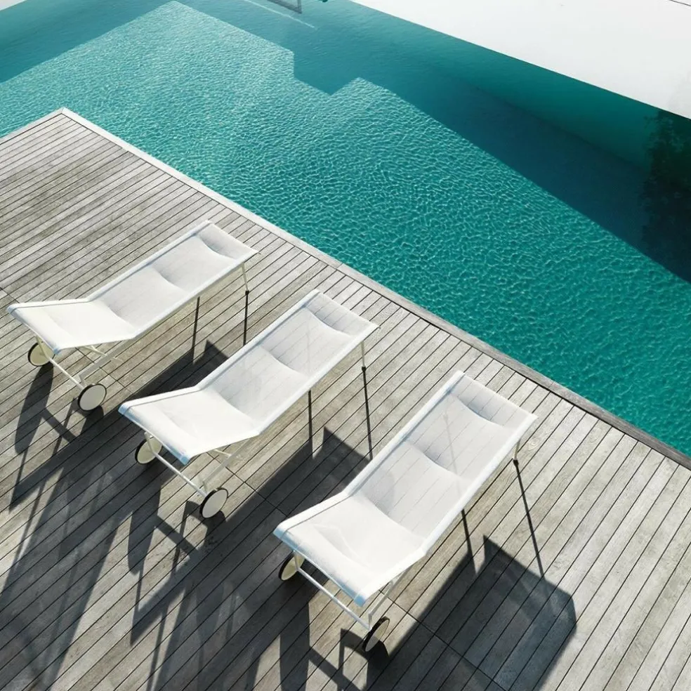 Die weiße Sonnenliege besticht durch ihr architektonisch klares, urbanes Design. Die verstellbare Rückenlehne ermöglicht Ihnen, je nach Bedarf bequem zu sitzen oder zu liegen. Die elegante 1966-42 Richard Schultz Sonnenliege passt besonders gut auf die Terrasse oder in den Poolbereich. Gerade im Schwimmbeckenbereich braucht man sich mit dieser Liege vor Wasserspritzern oder Feuchtigkeit nicht zu fürchten. Die widerstandsfähige Sonnenliege ist dafür wie geschaffen. Egal, welche Farben und Muster Ihre Auflagen, Sonnenschirme oder sonstigen Accessoires haben, die weiße Farbgebung der Liege passt sich allem mühelos an. Die Rollen am Fußende der Liege sind nicht nur dekorativ, sondern auch praktisch. So lässt sich die Liege mühelos von einem zum anderen Ort rollen, zum Beispiel, wenn der Stand der Sonne sich verändert hat.