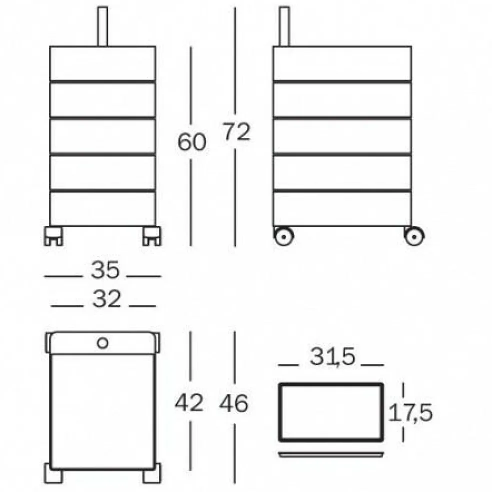 Der 360° Container mit Rollen H 72cm ist 32cm breit und 46cm tief. Er misst 72cm in der Höhe und ist mit fünf Schubladen ausgestattet, die jeweils 9,5cm hoch sind. Das Designstück ist in verschiedenen Farben erhältlich. Weiters gibt es ein höheres Aufbewahrungsmöbel aus der 360-Serie.