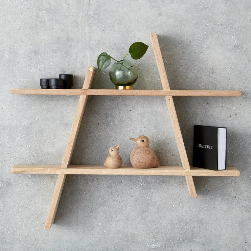 Wegen des Namens kaum überraschend ist das A-Shelf Wandregal wie der Buchstabe A geformt. Nur die Spitze fehlt, da sie die beiden schräg montierten Seitenteile an der Oberseite nicht berühren. Ganz wie es dem minimalistischen skandinavischen Design entspricht, ist das A-Shelf Wandregal auf das Wesentliche reduziert. Im Prinzip besteht es nur aus vier Brettern aus hochwertigem Eichenholz. Das verblüffend einfache Regal kann in unterschiedlichen Richtungen montiert werden. Das macht es zu einem ausgesprochen vielseitigen Möbelstück.