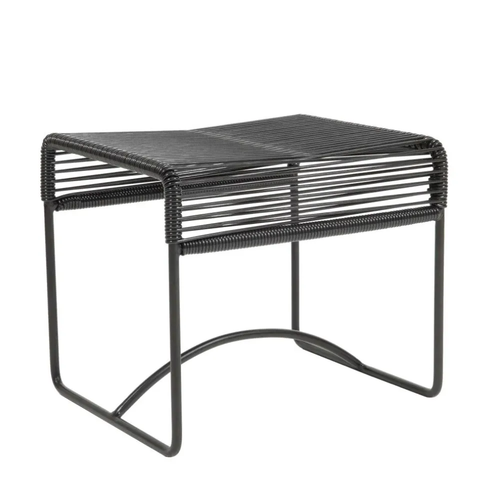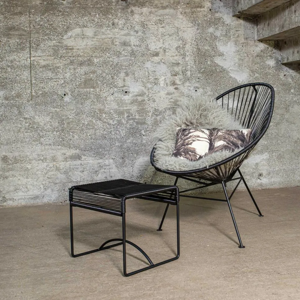 Eine leuchtend farbige Schnurbespannung macht den Acapulco Hocker zu einem auffälligen Blickfang. Sein dunkles Metallgestell reduziert sich hingegen auf seine statische Funktion. Es besteht aus pulverbeschichtetem Rundstahl. Zwei rechteckige Rahmen bilden die Beine, die an der Vorder- und der Hinterseite jeweils durch eine gerade Querstrebe miteinander verbunden sind. Eine gebogene Verbindung am Boden sorgt für zusätzliche Stabilität. Die Sitzfläche des Acapulco Hockers wird aus PVC-Schnüren gebildet, die sich über die oberen Rahmenteile ziehen. Sie spannen sich nicht nur in regelmäßigen Abständen zwischen die rechte und linke Rahmenkante, sondern umwickeln diese auch lückenlos, was dem Metall einen angenehm weichen und warmen Mantel schenkt. Ihrer elastischen Eigenschaft verdankt der Acapulco Hocker darüber hinaus seine bequeme Sitzfläche, die sich perfekt an den Körper anpasst. Er ist ein gemütliches Sitzmöbel und eignet sich auch zum Hochlegen der Beine. Der Hocker passt ins Wohnzimmer, auf die Terrasse oder in den Garten.