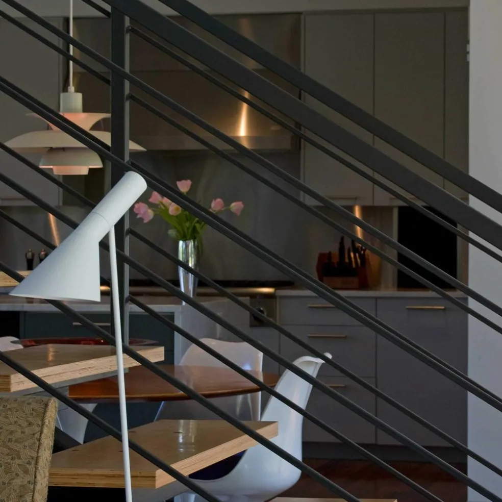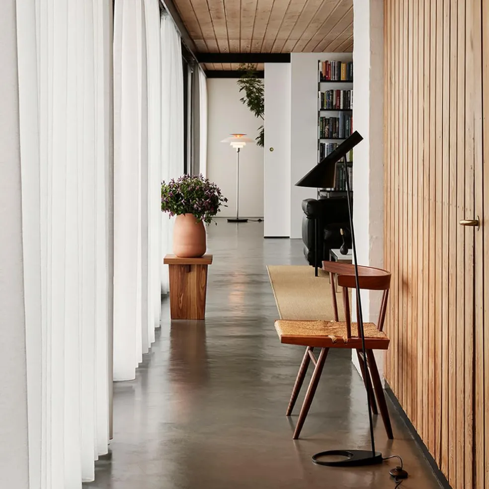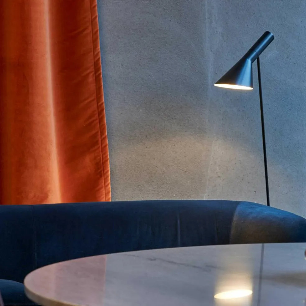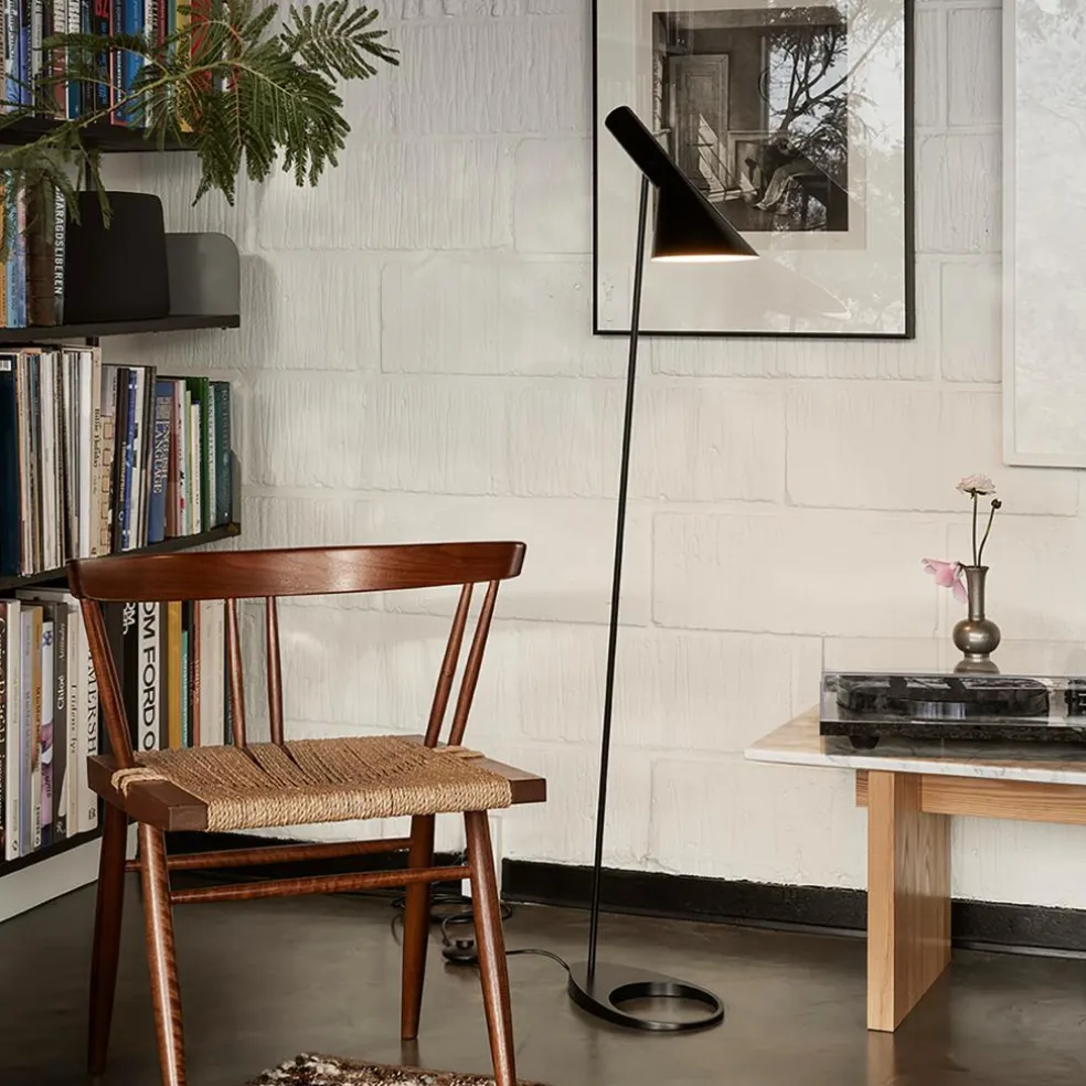 Die AJ Stehleuchte wurde von Arne Jacobsen für die Marke Louis Poulsen entworfen. Die Initialen des dänischen Designers sind namensgebend für die AJ-Kollektion, die 1957 für das SAS Royal Hotel in Kopenhagen entworfen wurde und heute zu den klassischen Designs für Wohnzimmer, Büro oder Flur zählt. Neben der AJ Stehleuchte zählt auch eine Tischleuchte zur Modellserie.
