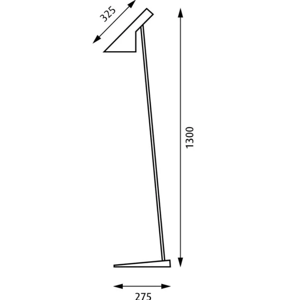 Das Profil der AJ Stehleuchte fällt mit geraden Linien und rechten und spitzen Winkeln auf. Eine grazile Eleganz mit klaren Formen kennzeichnen ihr Design. Auf einem leicht geneigten Stab sitzt der Leuchtenkopf, der sich aus einem schräg aufgesetzten Zylinder und einem schiefen Drehkegel zusammensetzt. Seine Innenseite ist weiß lackiert, was ein angenehm diffuses Licht erzeugt. Er wirft einen direkten und gerichteten Lichtschein in die Umgebung, der sich durch Schwenken des Leuchtenkopfes genau positionieren lässt. Stiel und Schirm der AJ Stehleuchte sind aus gezogenem Stahl. Der für die AF-Serie charakteristische Fuß mit kreisförmiger Aussparung besteht aus Zinkdruckguss.