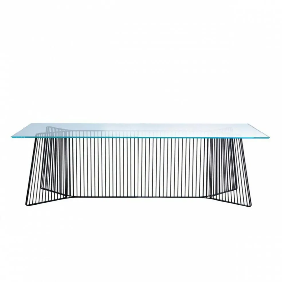 Ein bestimmendes Merkmal ist dabei die unkonventionelle Formen- und Materialkombination. Der Anapo Esstisch besteht aus Stahl und Glas. Dabei kommen hier keine herkömmlichen Tischbeine zum Einsatz. Stattdessen ruht die elegante gläserne Tischplatte auf einem stählernen Gittergestell, dass die Transparenz des Designs noch mehr unterstreicht. Auf diesem Tisch von Gordon Guillaumier zu sitzen, wird immer wieder zum Erlebnis. Mit seinen großzügigen Maßen von 250 x 105 x 74 cm strahlt er dabei jederzeit Ruhe, Größe und Funktionalität aus. Mit diesen Eigenschaften kann der Anapo Esstisch von Gordon Guillaumier nicht nur in privaten, sondern auch in geschäftlich genutzten Räumen zum Einsatz kommen.
