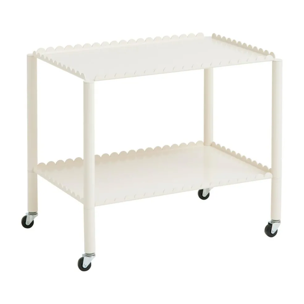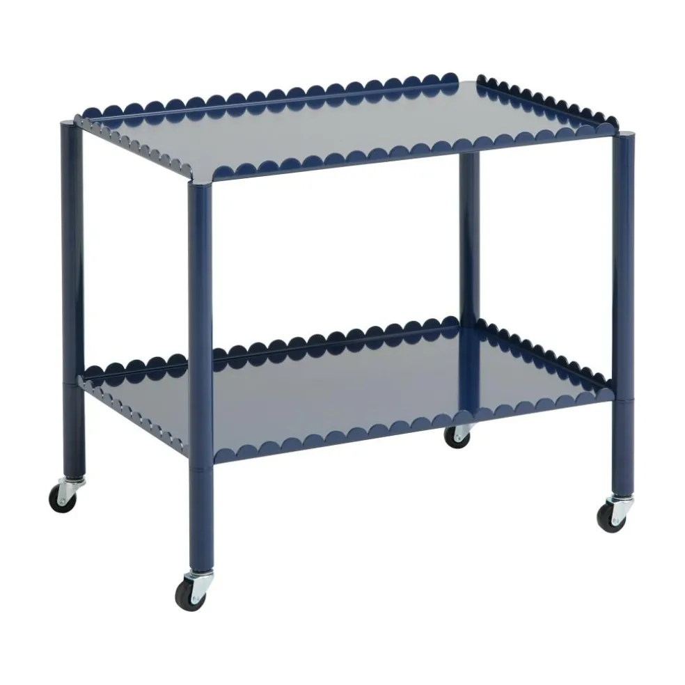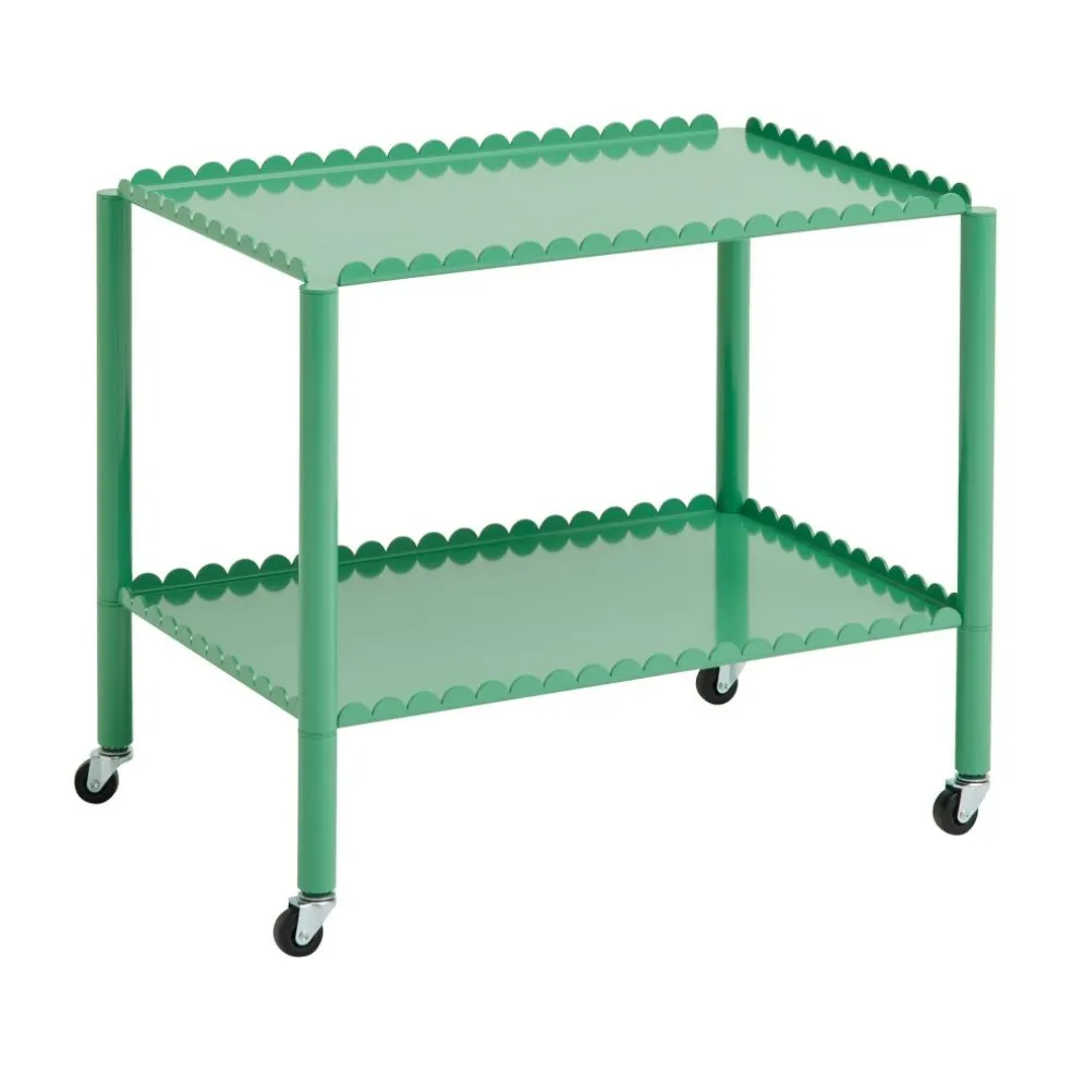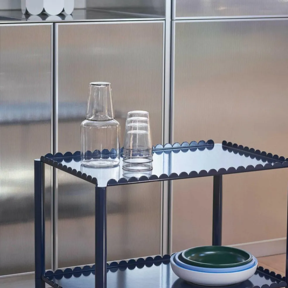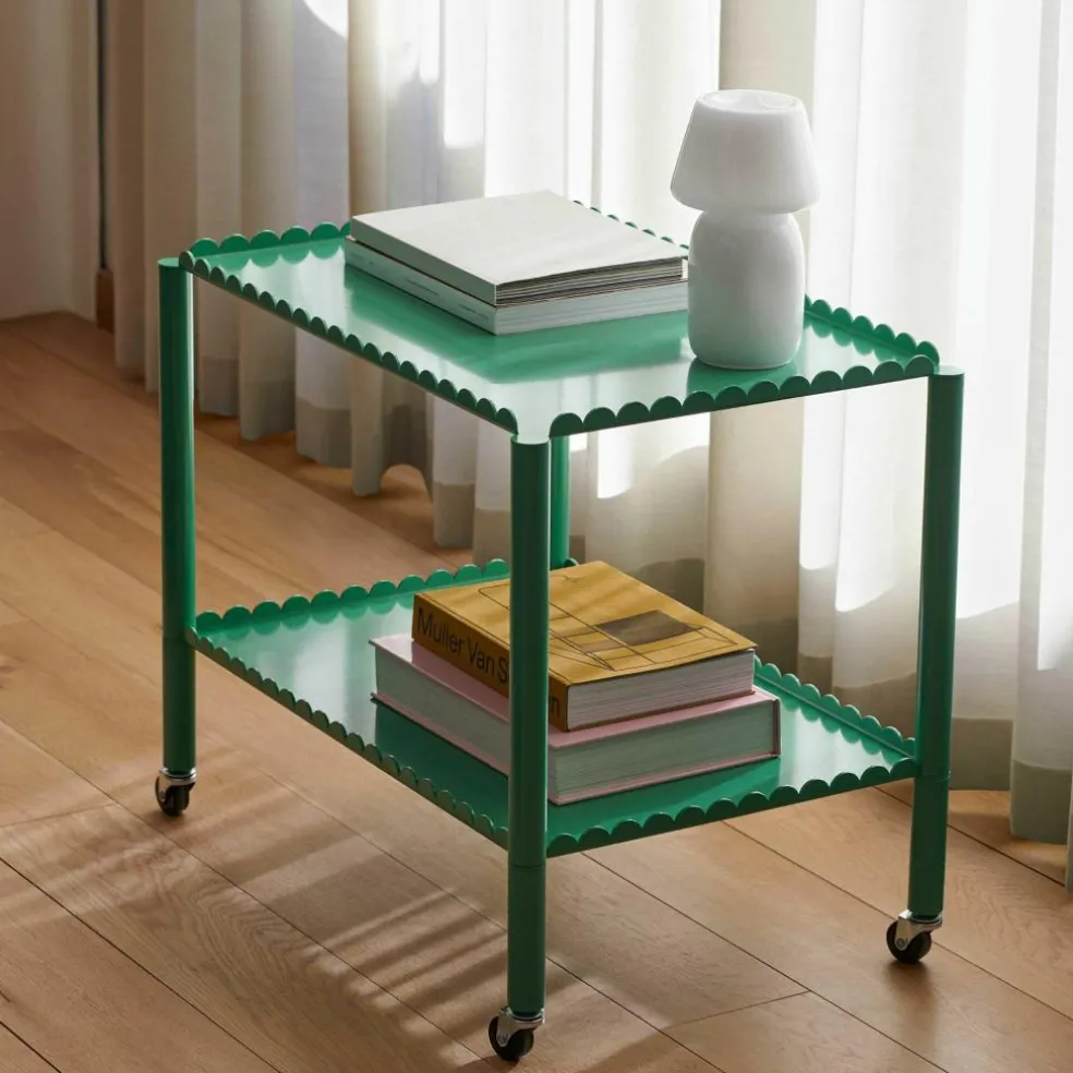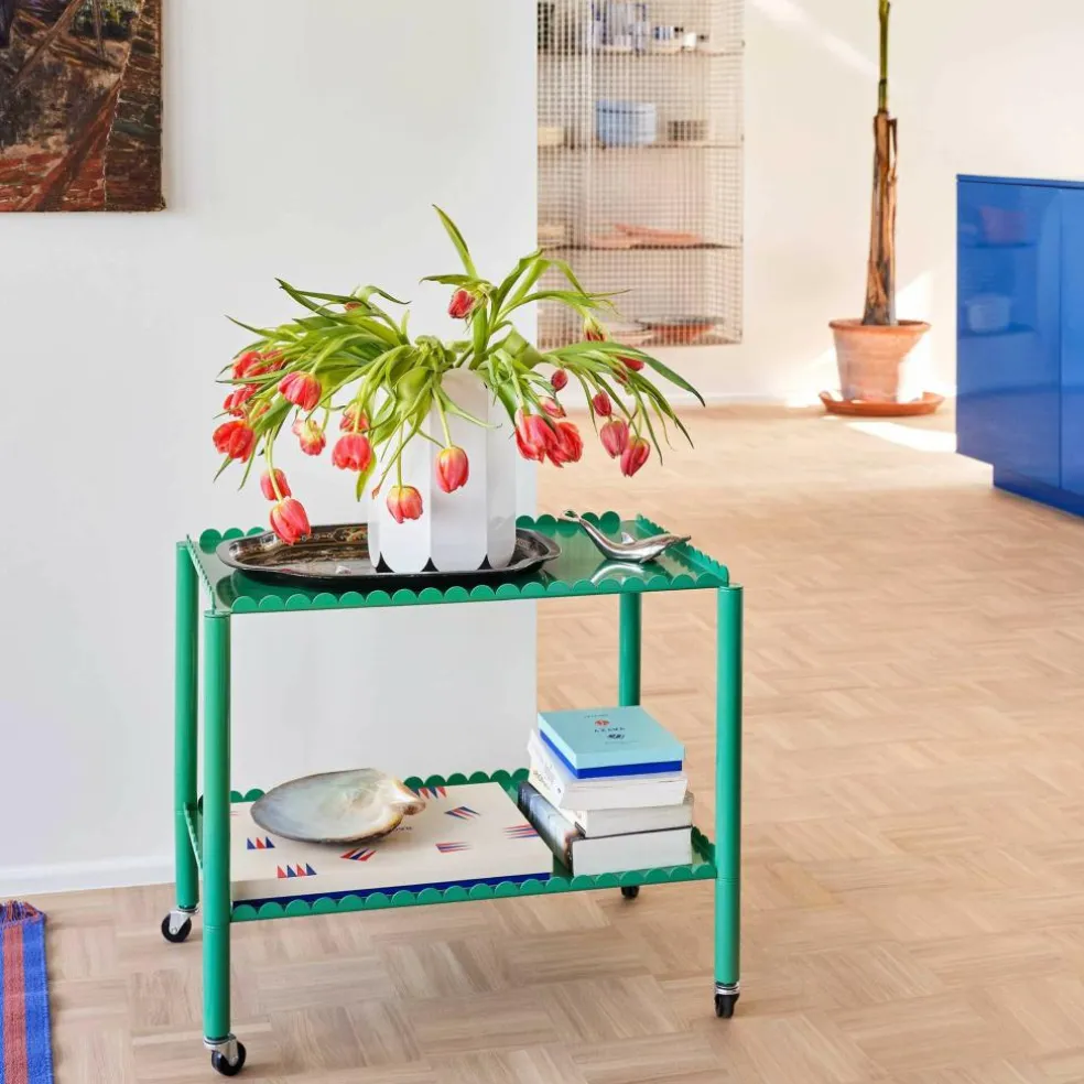 Der Arcs Servierwagen niedrig wurde von Muller van Severen für die Marke HAY entworfen. Er ist Teil einer verspielten Designserie, die ihre Bezeichnung von den Zierleisten ableitet, die sich aus kleinen aneinandergereihten Halbbögen zusammensetzen. Damit bringen die Arcs-Modelle einen dynamischen Pep in den Raum.