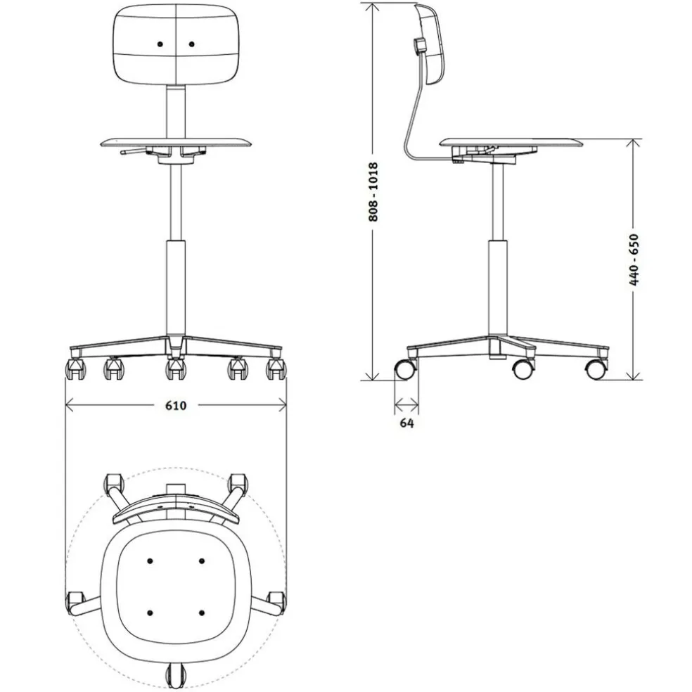 Mithilfe einer Gasdruckfeder kann man die Höhe des Atelier Modell 2100 Bürostuhls verstellen. Die Sitzhöhe beträgt demnach 44 bis 65 cm und die Höhe von 80,8 bis 101,8 cm. Das Modell wiegt 8,8 kg. Die Breite und die Tiefe betragen jeweils 61 cm. Der schmale Atelier Modell 2100 Bürostuhl passt auch zu kleinen Tischen.