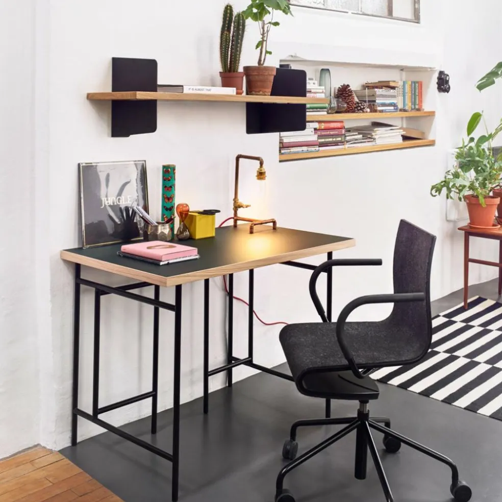 Das preisgekrönte Wandregal ist simpel wie raffiniert: Zwei Winkel aus Stahlblech treffen auf einen Regalboden, der aus einer massiven 3-Schichtplatte Fichte/Tanne gefertigt ist. Dieser ist farblos lackiert mit einem Weißanteil – eine warme wie zurückhaltende Kombination zu den farbig Basaltgrau, RAL 9005, pulverbeschichteten Winkeln, die eher industriell und kühl wirken. Die Montageschrauben des Atelier Wandregal 100x30x29,5cm werden von dem Regalboden abgedeckt und sind so nicht sichtbar. Das Regal hat eine Breite von 100 cm und eine Tiefe von 30 cm. Es eignet sich hervorragend für modern-stilvolle Einrichtungen und macht sich besonders gut in Wohn- oder Arbeitszimmer. Auf dem Wandregal können Bücher, Pflanzen sowie Deko- und Kunstobjekte präsentiert werden. Die beiden seitlichen Winkel dienen nicht nur als Tragwerk, sondern können zugleich auch als Buchstützen genutzt werden. Das Regal ist 29,5 cm hoch. Diese Variante mit einem Regalboden kann auch als Konsole oder kleiner Schreibtisch genutzt werden, sollte allerdings nicht zu stark belastet werden. Für die Reinigung genügt ein leicht feuchtes, weiches Tuch.