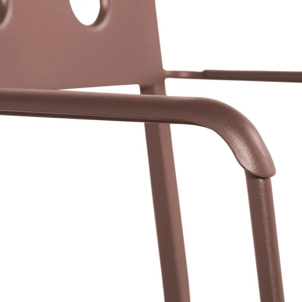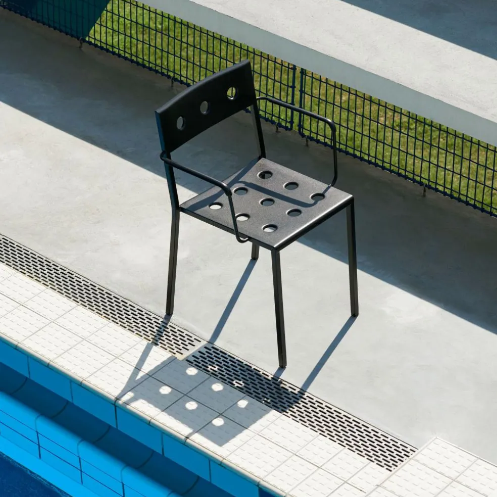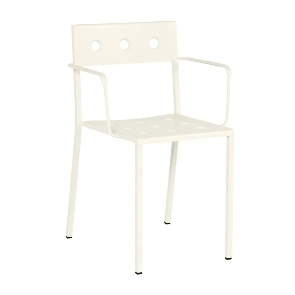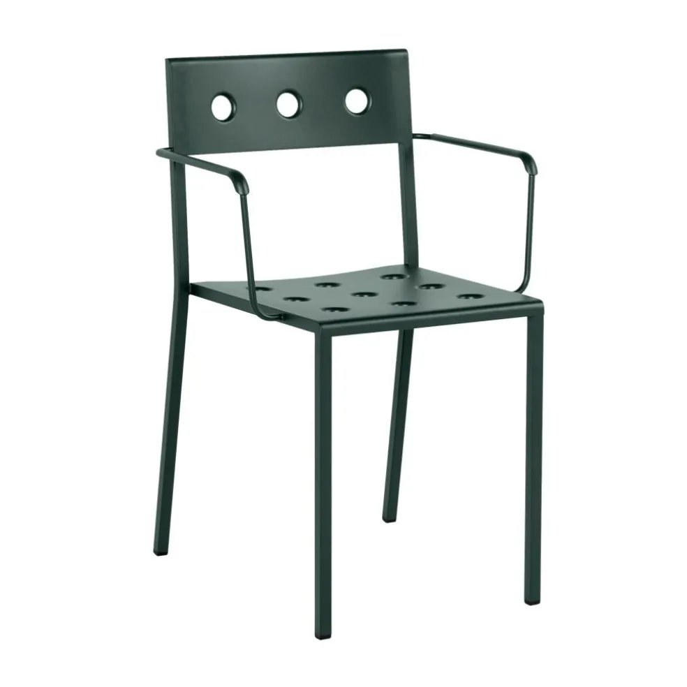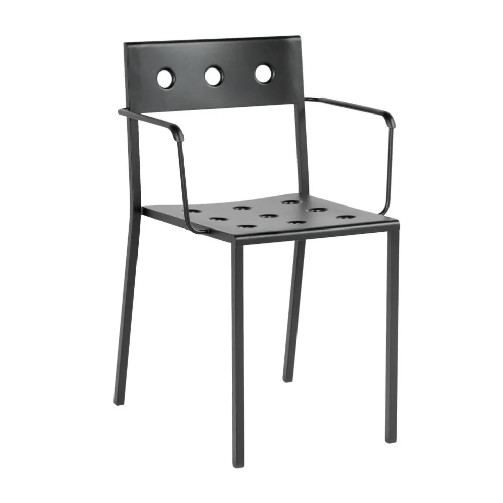 Der Balcony Gartenarmlehnstuhl kann nicht verwechselt werden: Immerhin weisen die Sitzfläche und die Rückenlehne markante Löcher auf. Exakt 16 Löcher durchbrechen die Sitzfläche, acht sind es bei der Rückenlehne. Da die Sitzfläche leicht nach hinten geneigt ist, begeistert das Modell mit ausgezeichnetem Komfort. Das Outdoormöbel kann bei jedem Wetter im Freien bleiben. Es besteht aus pulverbeschichtetem Stahl, eine Speziallegierung schützt es vor Witterungseinflüssen. Regen fließt durch die Löcher schnell ab, Restnässe kann mit einem Tuch abgewischt werden. Sollten einige Stühle nach einer Gartenparty oder im Freibereich eines Restaurants nicht mehr benötigt werden, können bis zu zwölf Stück übereinandergestapelt werden.